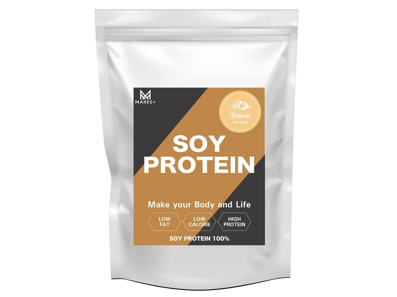 MAKES+(メイクスプラス)の「ソイプロテイン」は、肉体管理を行う本格アスリートから、健康維持を心がけるすべての人にオススメのソイプロテイン。たんぱく含有量は86.38%と高く、香料、着色料、人工甘味料不使用となっている。