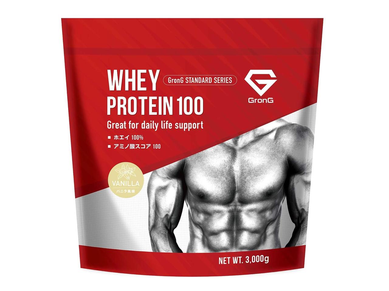 GronG(グロング)の「ホエイプロテイン100」は、100g当たり75g以上のたんぱく質を配合したプロテインパウダー。11種類のビタミンを配合し、アミノ酸スコアも100。効率よく身体づくりをサポートしてくれる。