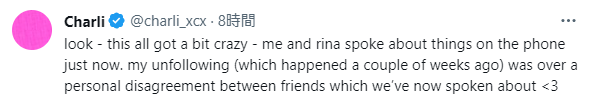 SNS上で、“チャーリーとリナがThe 1975を巡って喧嘩している”というウワサが過熱するなか、チャーリー本人がツイッター(X)を更新。リナと電話で話したことを明かし、こう語った。
