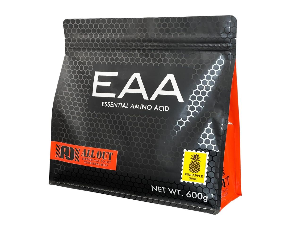 ALLOUTの「EAA」は、体内で作り出せない必須アミノ酸全9種類を完全配合。3秒シェイクですぐ溶け、アミノ酸特有のにおいも解消。トレーニング時のエネルギー源となるマルトデキストリンも配合しているので、これひとつで筋トレ時に必要な栄養素を素早く摂取できる。