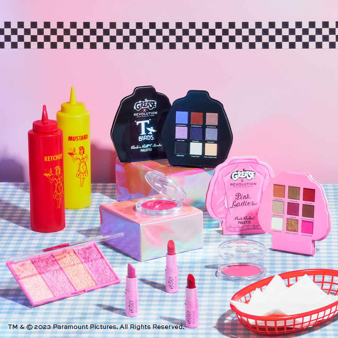 アイシャドウパレットは、車型のパレットにロゴを大胆にあしらった多色アイシャドウパレットのほか、作中に登場する女性不良グループPinkLadiesと男性不良グループT-Birdsのジャケットをイメージしたアイシャドウパレットも。