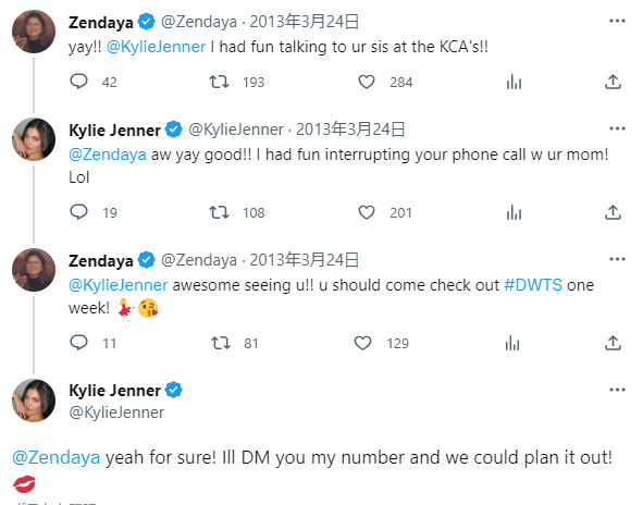 そんなゼンデイヤは、ひとつ年下のカイリーとはずいぶん前からの知り合い。2人が15~16歳だった2012~2013年にはX(旧ツイッター)でよくお互いにポストし合っており、2013年3月には、ゼンデイヤが当時出演中だったダンスコンペティション番組『ダンシング・ウィズ・ザ・スターズ』の収録にカイリーを誘い、カイリーが「私の電話番号をDMするね」と返していた。ちなみに最近ではXでの交流はないが、インスタグラムではゼンデイヤがカイリーをフォローしている。