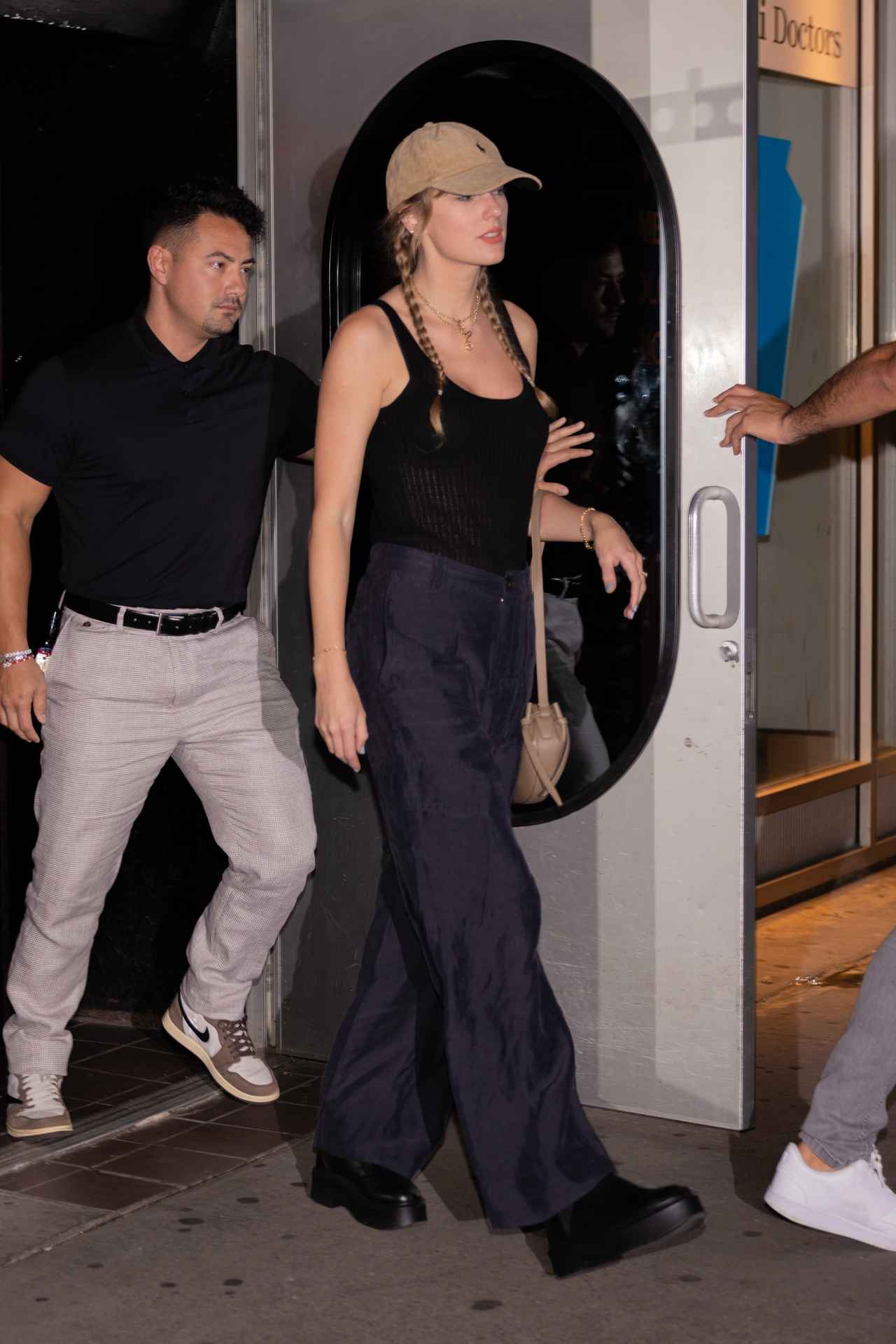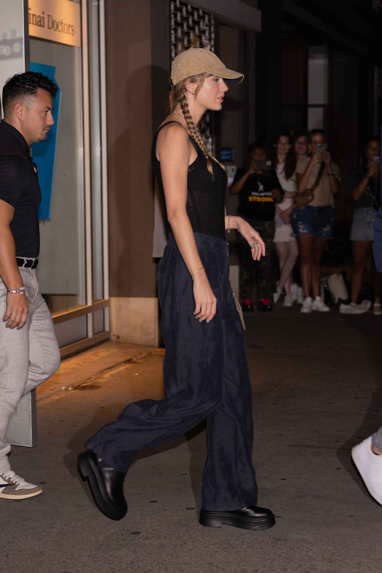黒のタンクトップにワイドパンツ、ブーツでまとめたオールブラックコーデに、ベージュのキャップを合わせたクールな装いでスタジオをあとにしたテイラー。深夜にもかかわらず、スタジオの前にはテイラーの姿をひと目見ようと多くのファンが集まった。