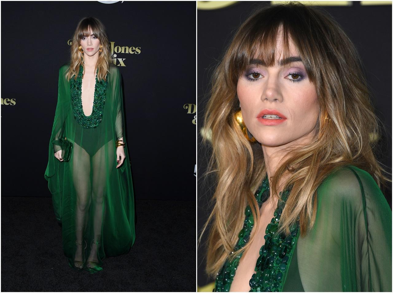 ドラマ『デイジー・ジョーンズ・アンド・ザ・シックスがマジで最高だった頃』のプレミアでは、パープルのアイシャドウを大胆に使ったディスコティックなメイクに挑戦。パープルカラーで目元をぐるりと囲み、上下のまつげを強調することで80年代っぽいメイクの完成。