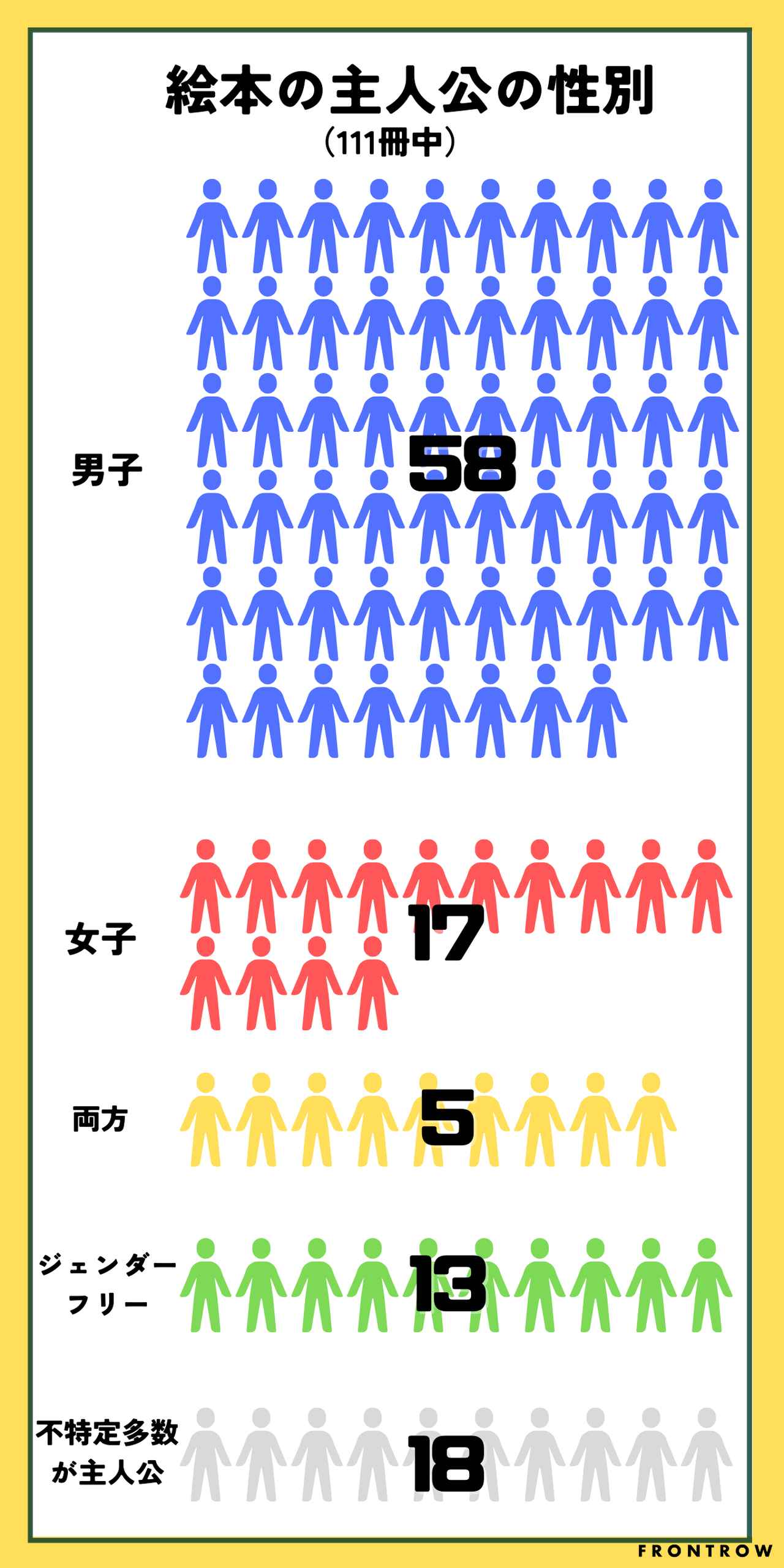 その結果、合計111冊中、男の子・男性が主人公のものは58冊、女の子・女性が主人公のものは17冊だった。つまり、男の子の主人公が登場する絵本は女の子の主人公が登場する絵本の約3.5倍。