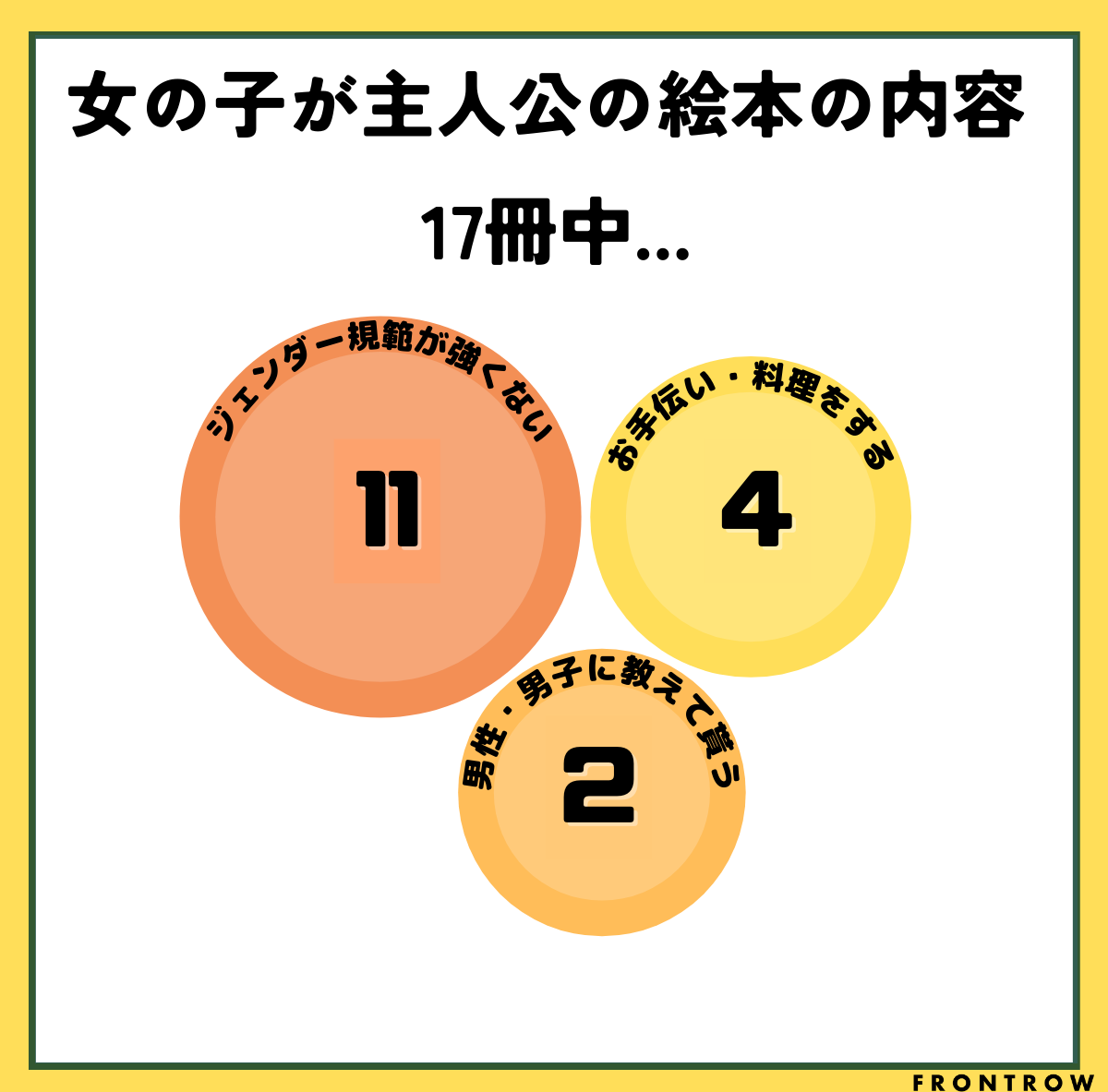 そして、女の子が主人公の絵本は17冊あったが、うち4冊は主人公の女の子が料理やお手伝いをしている内容で、2冊が男性や男の子に助けてもらう内容だったため、女の子が主人公の絵本でジェンダー規範が強くない内容のものに限ると11冊という結果になった。うち国内の絵本は4冊。