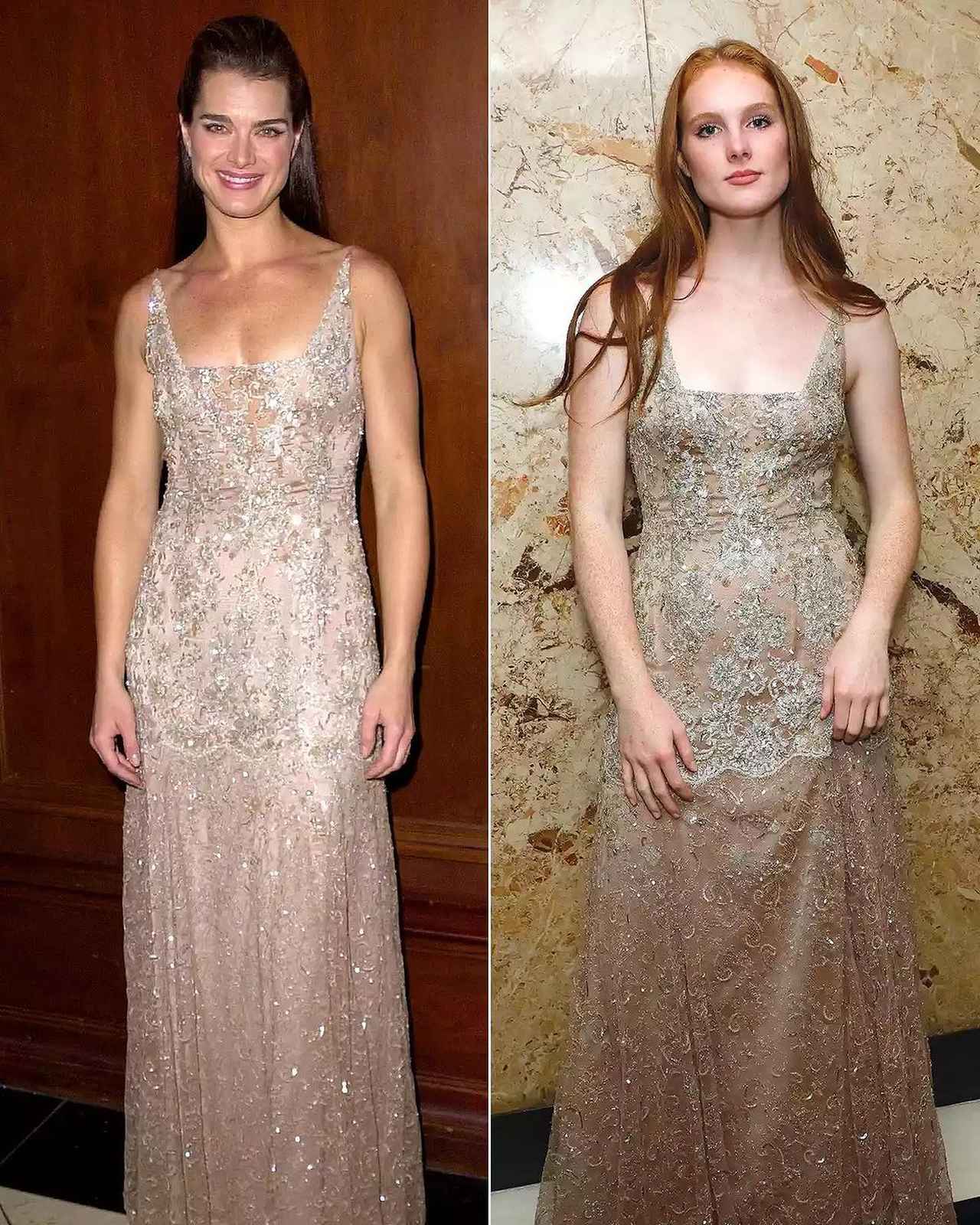 「22年越しのできごと。私が2001年に着たバッジェリー・ミシュカのドレスを、今週、グリアがカフェ・カーライルでの私のプレミアイベントで着たんです」と明かしたブルックは、22年前の自分の写真と娘の写真を並べて公開。