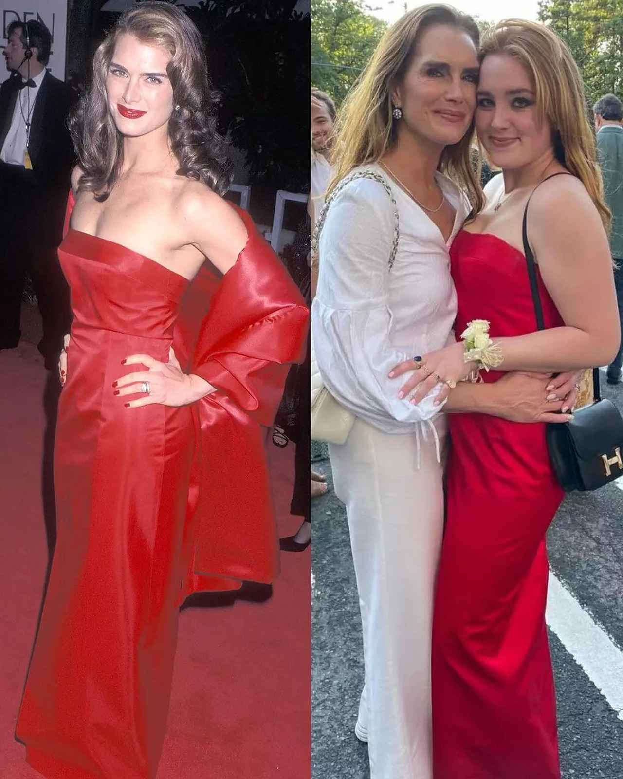 またブルックはこの投稿で、第1子であるローワンとも20年越しの着回しをしたことを写真と共に報告。こちらは、ブルックが1998年のゴールデン・グローブ賞授賞式に着たレッドのドレスで、ローワンは学校のプロム(卒業記念パーティー)に着て行ったという。