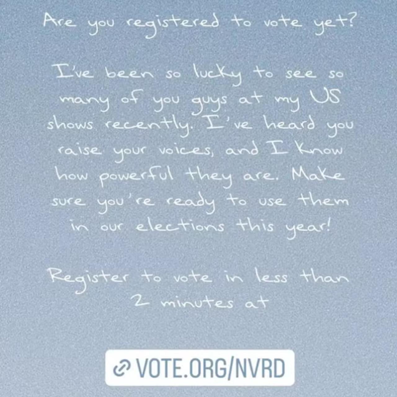「有権者登録はお済みですか? 最近の私は、アメリカでのショーで皆さんに会えて本当に幸運です。皆さんが声を張り上げるのを聞いて、それがどれほど力強いものかを味わえました。今年の選挙でも皆さんのその声の力を発揮してくださいね! 有権者登録を2分以内にVOTE.ORGから行なってください」