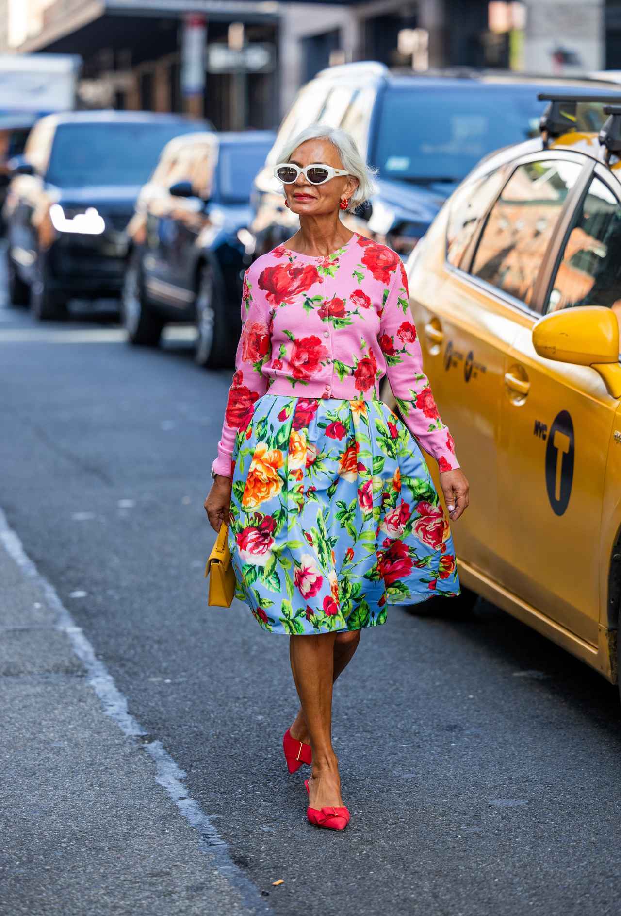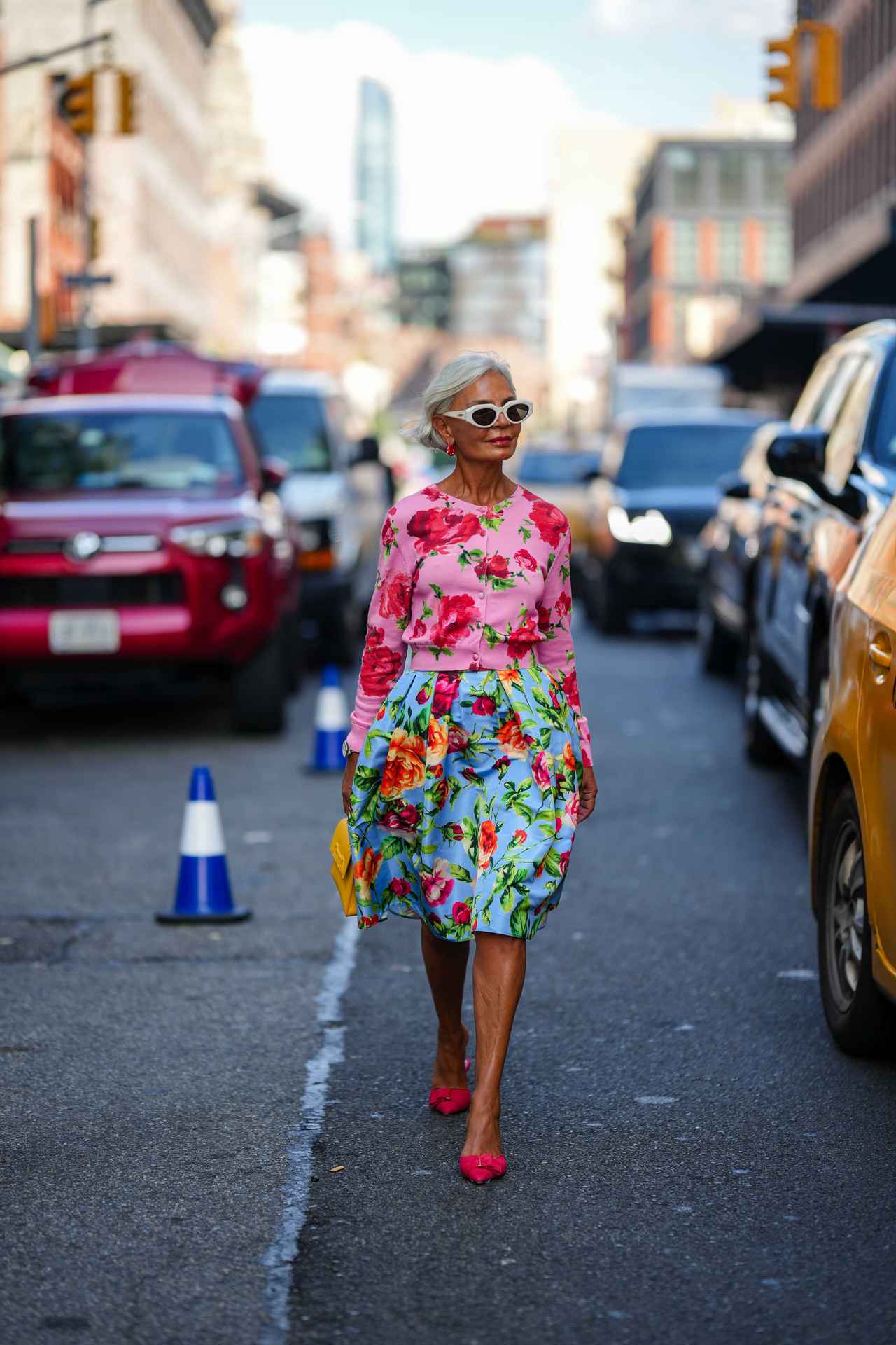 一見難しそうに見えるカラーの組み合わせながらも、カーディガンとスカートのフローラルモチーフで統一感を出して。白のラウンドサングラスでスパイスを加え、バッグでヴィヴィッドなイエローを投入し、パワーに満ちたエイジレススタイルの完成。