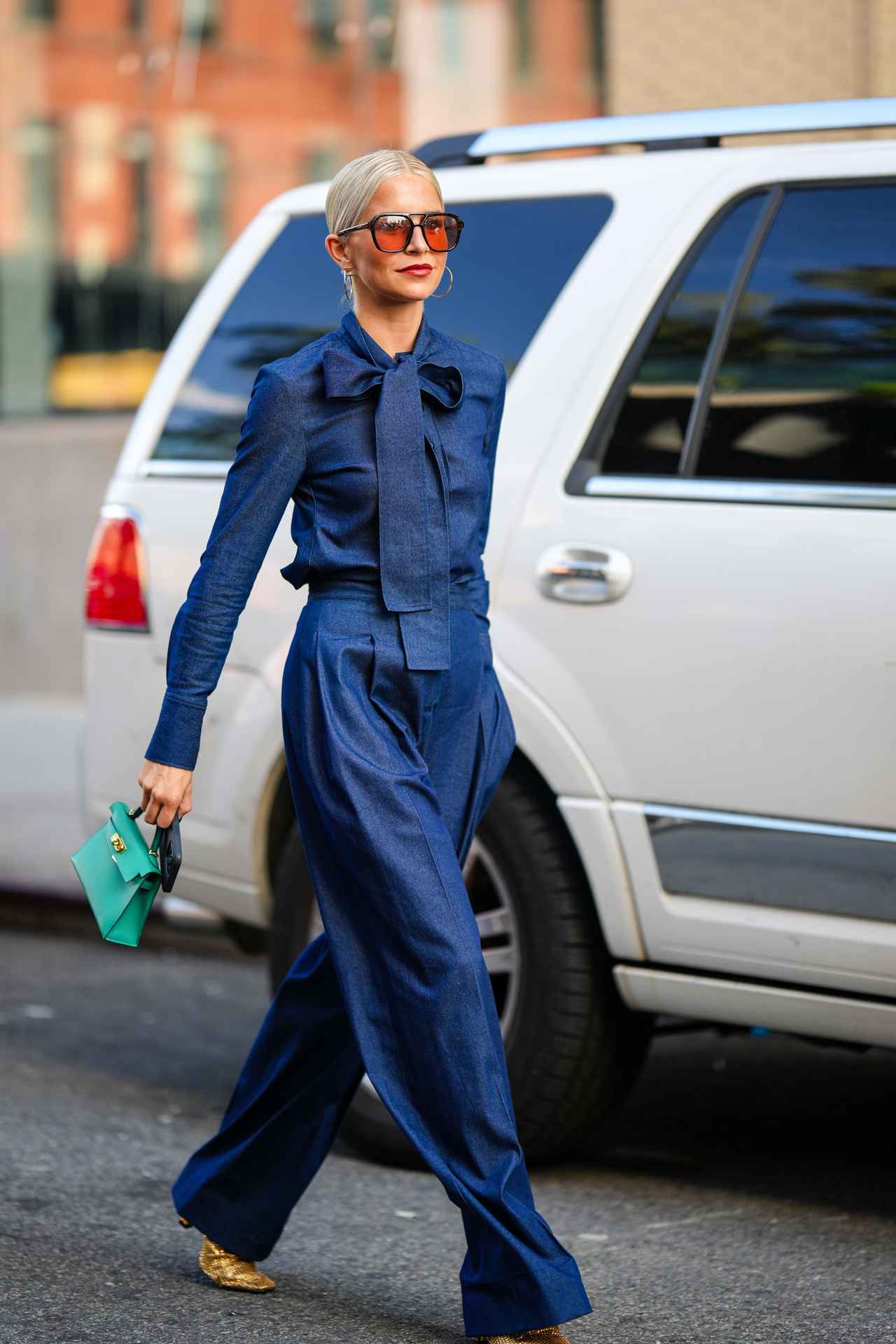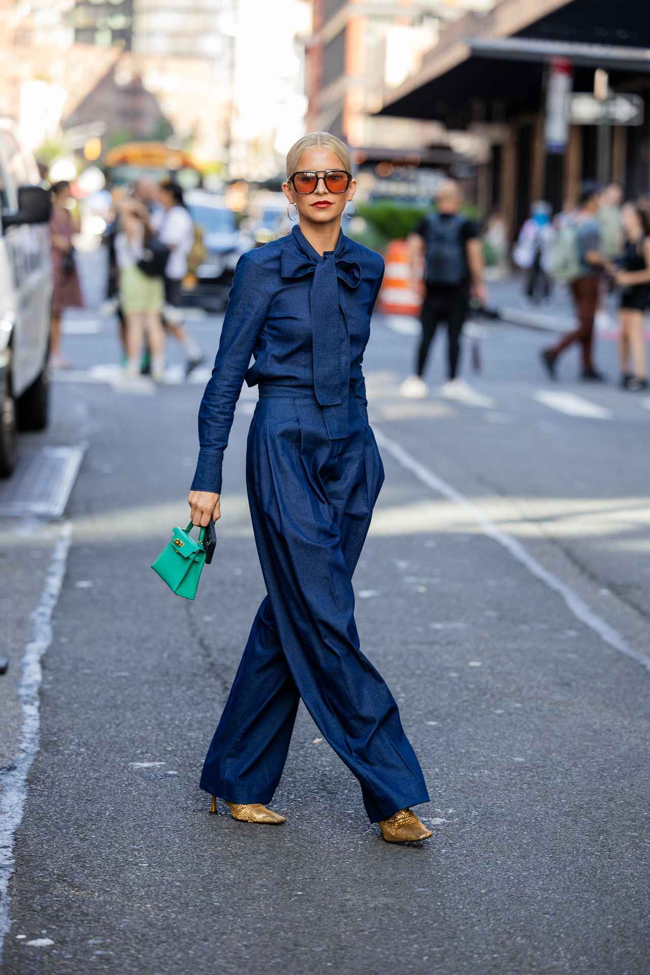 デニムライクなインディゴカラーが綺麗なセットアップの差し色として、ミントグリーンのミニケリーを投入するのはさすが。ビッグサングラスやフープピアスでモードな勢いを加速。