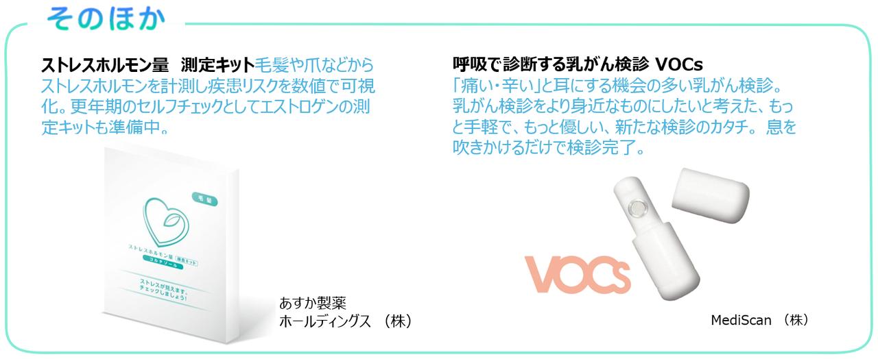 そのほか、ストレスホルモン量測定キットや呼吸で診断する乳がん検査「VOCs」など、女性ならではの健康課題やお悩みを解決するフェムテック・フェムケア製品が多数。
