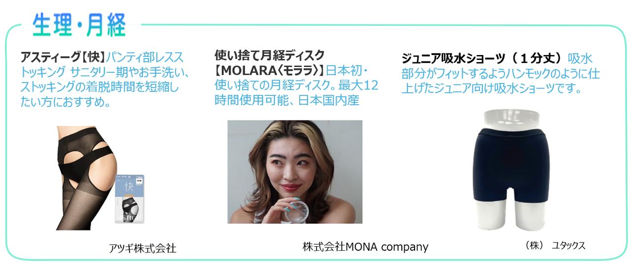 生理に関係する製品では、日本初の使い捨て月経ディスク「MOLARA」や、生理期間でも履きやすいパンティ部レスストッキング「アスティーグ【快】」などが登場。女性にとって悩みの種になりがちな生理期間をより快適に過ごせるアイテムが集う。