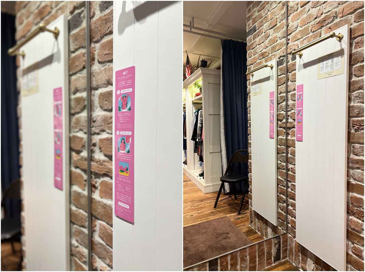 2017年から10月にビームスが継続して行なっているのが、試着室での啓もう。女性用試着室(男女兼用含む)にセルフチェックガイドを掲出し、着替えるついでに簡単なセルフチェックを促す活動を中心に継続。ブレスト・アウェアネスを身につけることで小さな変化に気付けるようになると同時に、乳がん検診を受けることや、医療機関に相談することに対するためらいが軽減されることを期待している。