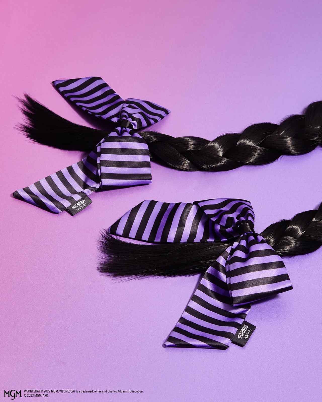 とくに注目したいのは、ブラックとパープルと貴重とした「リボンアクセサリー(2本セット)」。少し大ぶりのリボンで、可愛さと不気味さのバランスが絶妙。ウェンズデーのトレードマークである“おさげ髪”に合わせたくなること間違いなし。
