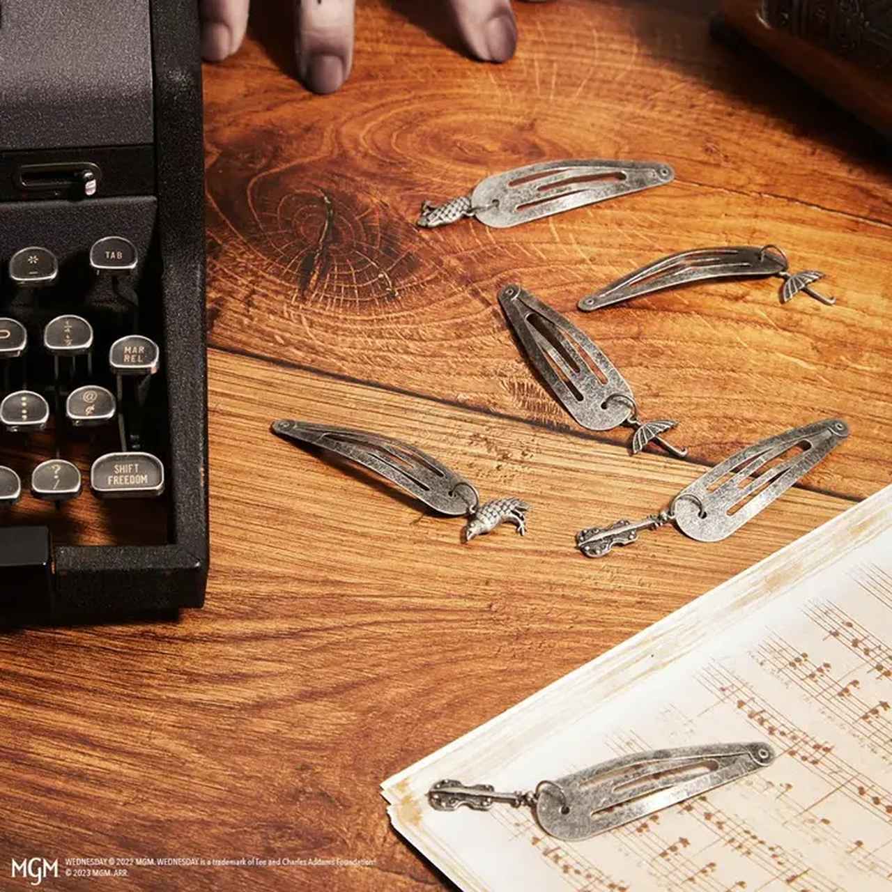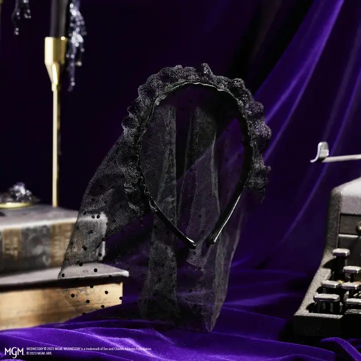 また、ウェンズデーがダンスシーンで着用したドレスをイメージした黒レースの「ベール付きカチューシャ」や、ウェンズデーが弾いていたチェロ、カラス、傘のモチーフが付いたシルバーの「ヘアピン(6本セット)」など、劇中を彷彿とさせるアイテムが登場。