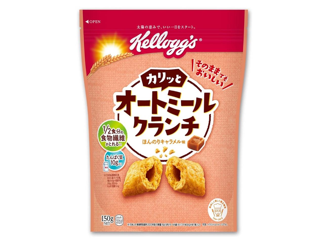 ケロッグの「オートミールクランチ」は、朝食でも間食でも食べやすいカリッと食感で、ほんのりキャラメル味のオートミールクランチ。オートミールがそのまま調理なしで食べられ、2分の1食分の食物繊維、たんぱく質10gを摂ることができる。