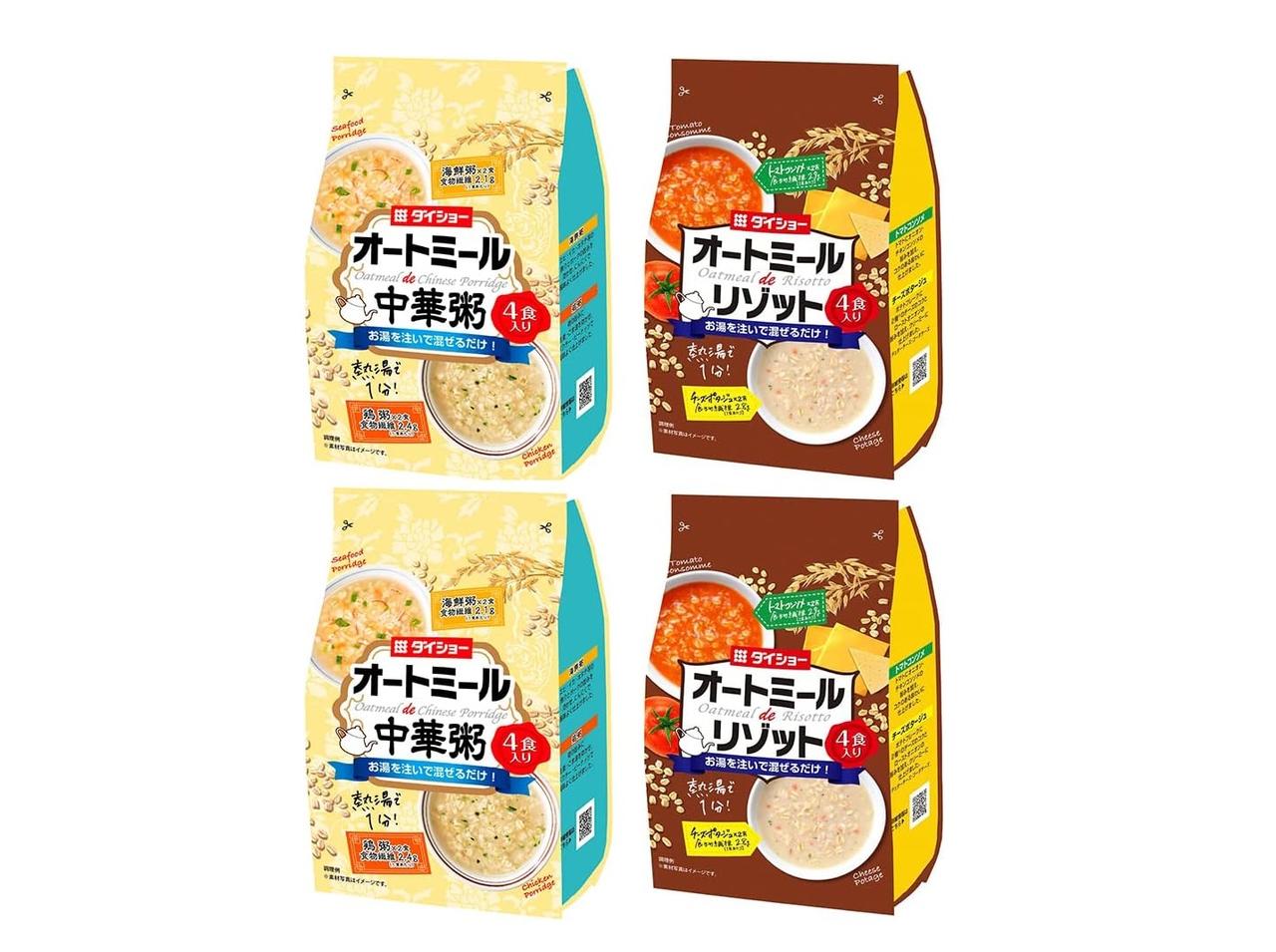 ダイショーの「オートミール 2種アソート セット」は、リゾット風の「オートミールdeリゾット トマト&チーズ」とおかゆ風の「オートミールde中華粥 鶏粥&海鮮粥」のセット。オートミールが苦手な人にも食べやすく、体を温める朝ごはん、ランチのお供、小腹が空いた時にピッタリ。