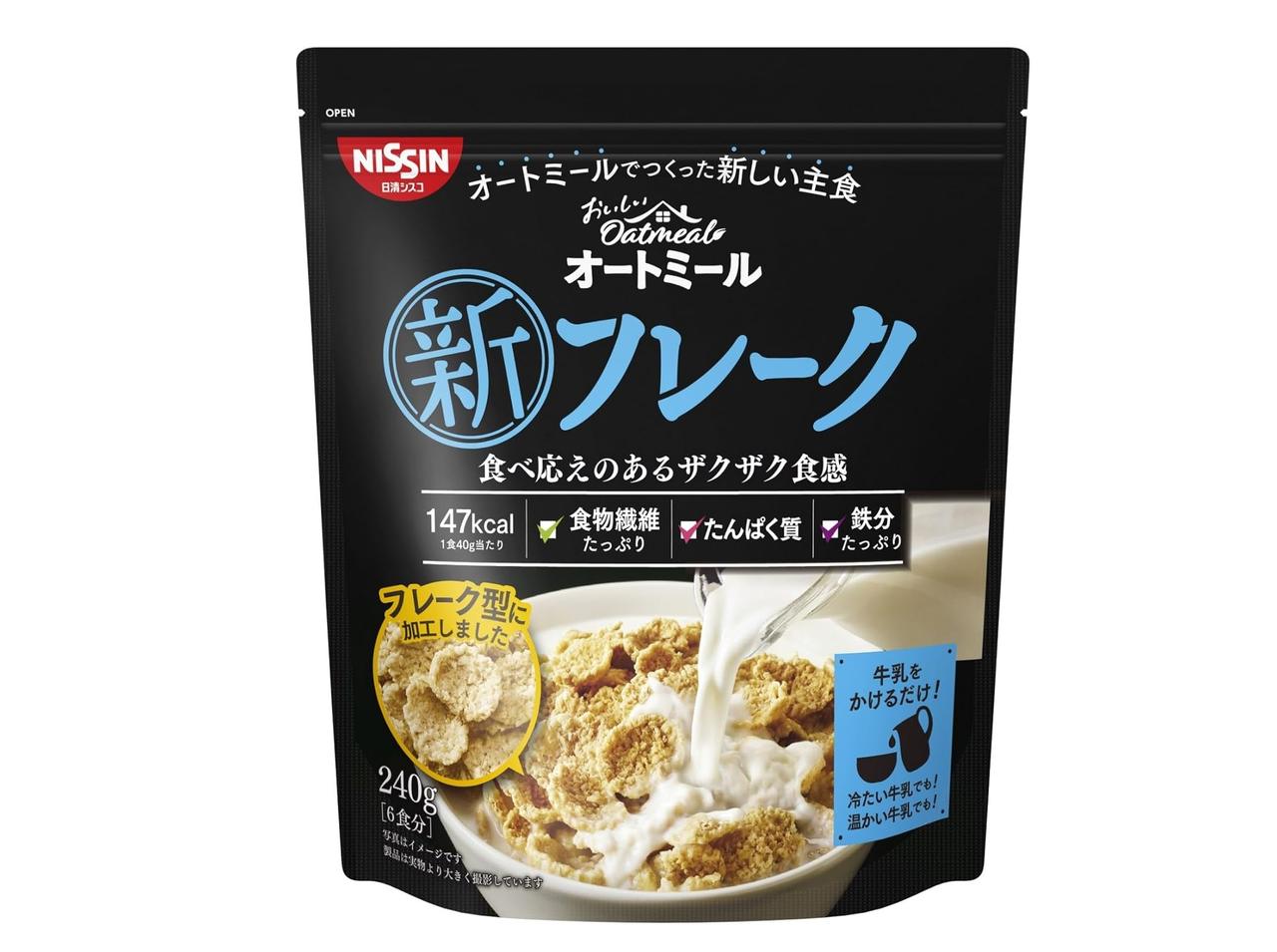 日清シスコの「おいしい オートミール 新 フレーク」は、フレーク型で食べやすいザクザク食感のオートミール。1食40gで147キロカロリーであり、コーンフレークに比べて低糖質。牛乳をかけるだけでなく、そのままでも美味しく食べられる。