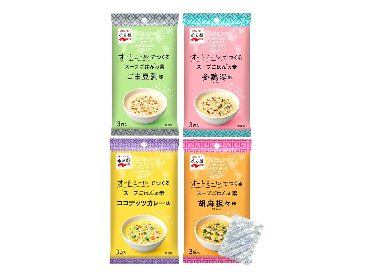 オートミールにプラスするだけで美味しいアレンジが楽しめるのが、永谷園「旅する SOUP MEAL オートミールでつくるスープごはんの素」。胡麻担々味、ココナッツカレー味、ごま豆乳味、参鶏湯味がぞれぞれ3袋ずつ入ったアソートセットなら、飽きることなく取り入れられる。