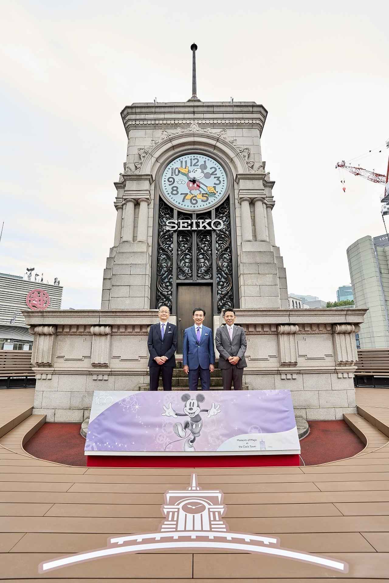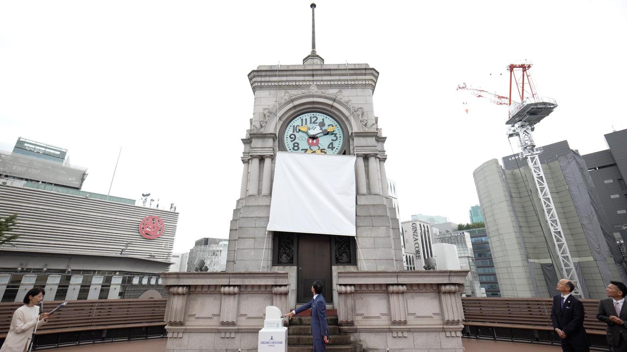 イベントでは、セイコー代表取締役会長兼グループCEOに服部真二氏が、今回の特別な取り組みに関して、「91年前の誕生以来、銀座の街のシンボルとして皆様に親しまれてきたこの時計塔の文字盤にキャラクターをあしらうのは、今回がはじめての試み」「セイコー創業の地である銀座から、世界中の人々に笑顔を届ける使命を果たすべくこれからも努力を続けてまいります」などと話し、その後、ミッキーマウスデザインの時計塔が除幕された。
