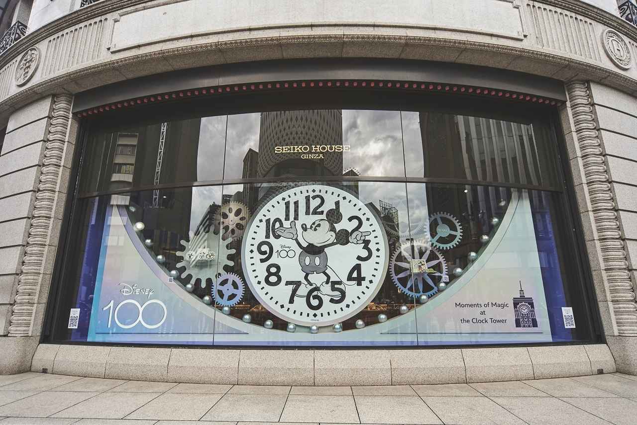 ウォルト・ディズニー・カンパニーが2023年10月16日(月)に創立100周年を迎えることを記念して、10月5日(木)から11月18日(土)までの期間限定で、東京・銀座四丁目にあるSEIKO HOUSE GINZA 時計塔の文字盤がミッキーマウスのデザインに模様替えされている。