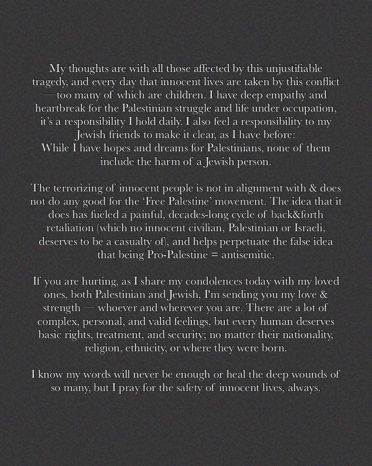 「もしあなたが傷ついているのなら、私の愛する人たちと共に哀悼の意を送りますし、パレスチナ人とユダヤ人のどちらにも、あなたが誰であろうとどこにいようと、あなたに愛と力を送ります。とても複雑で、個人的で真実に基づいた感情がありますが、国籍や宗教、民族、生まれた場所に関係なく、人間は誰しもが基本的な権利や扱い、安心を享受する権利があるのです」。