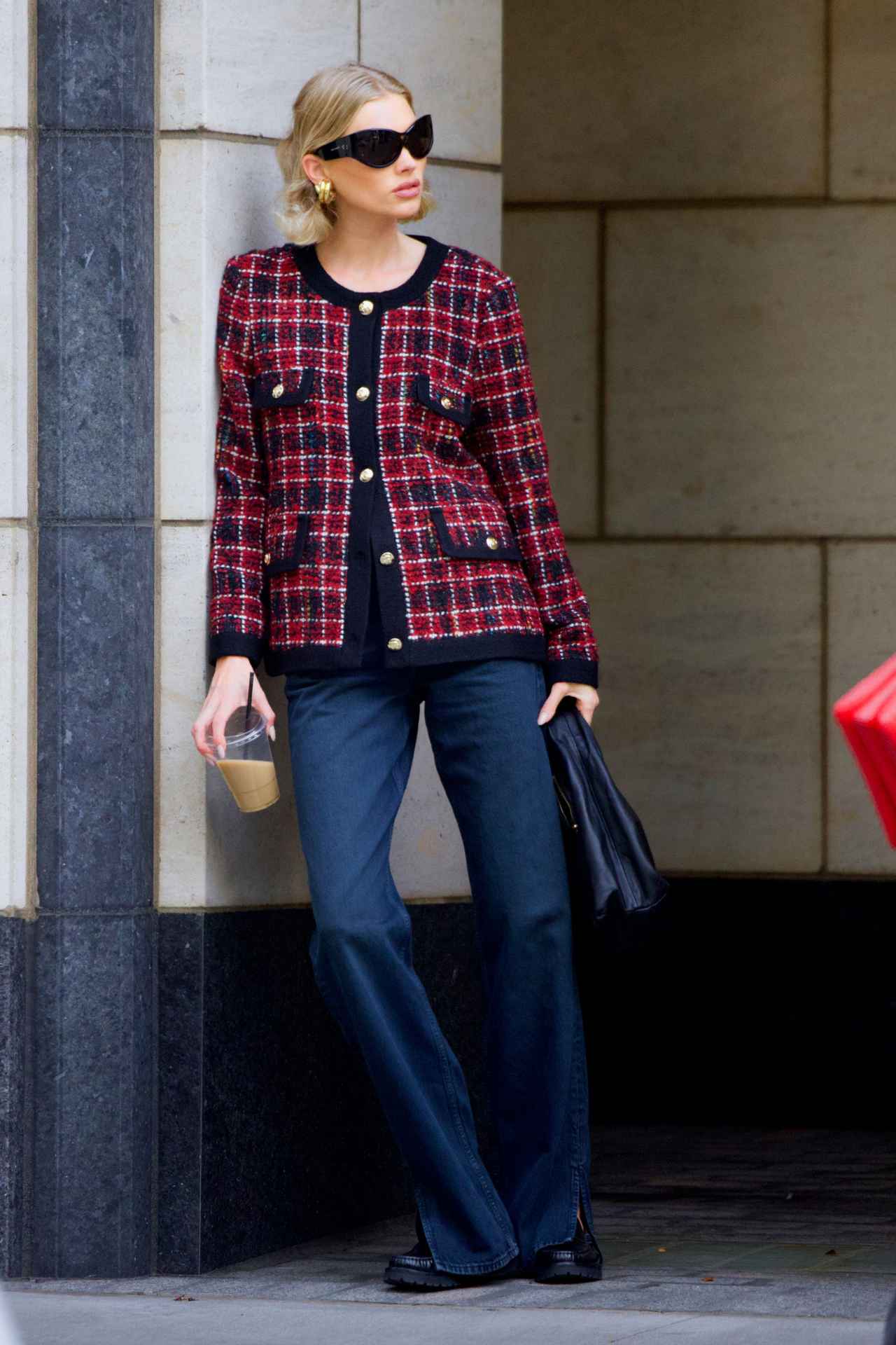 この日の主役は、秋コーデには欠かせないツイードジャケット。秋のムードにピッタリな赤のツイードジャケットは、ゴールドのボタンをあえて全部は閉めずカジュアルに着こなすのがエルザ流。