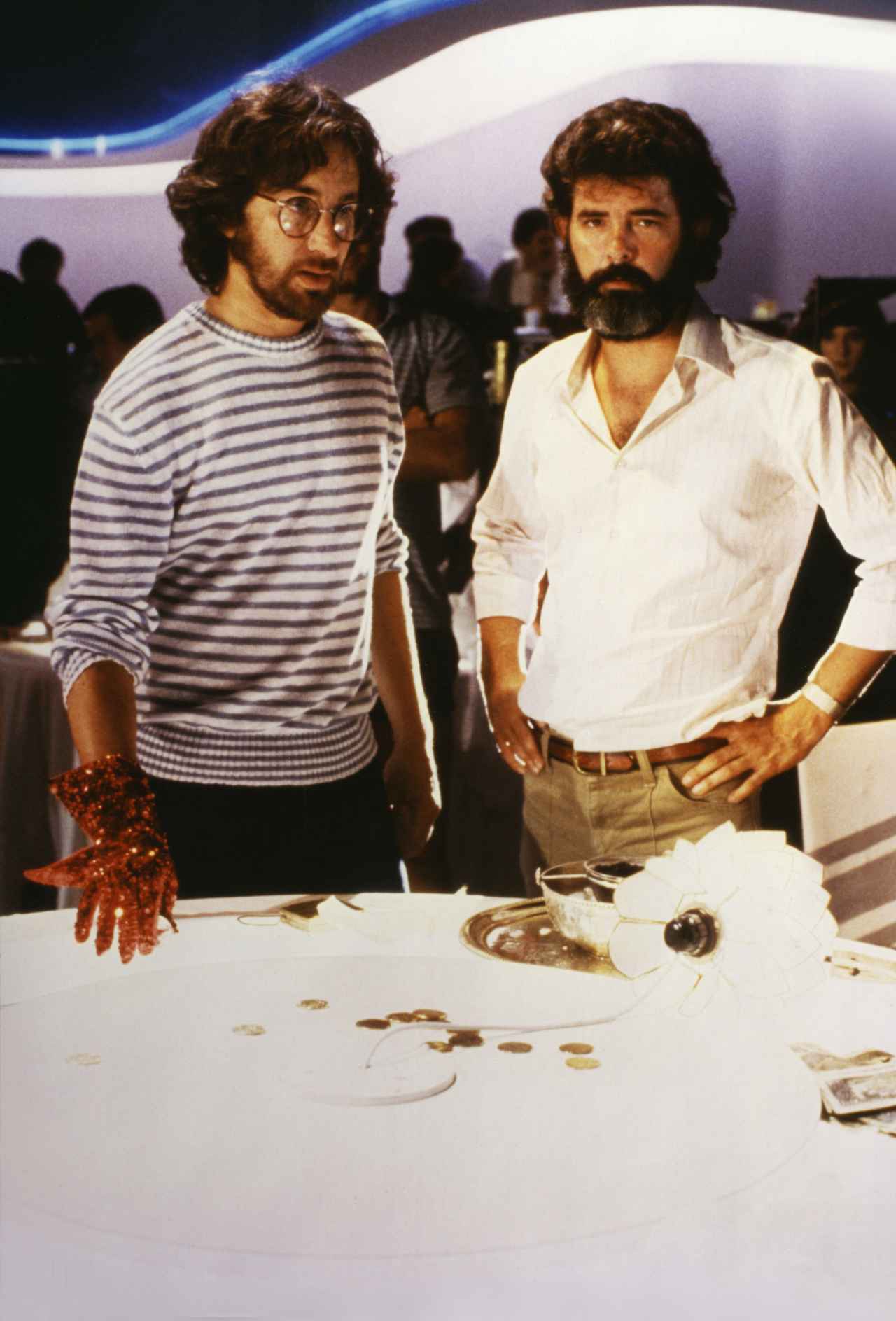 1984年の映画『インディ・ジョーンズ/魔宮の伝説』の撮影セットでのスティーブン・スピルバーグとジョージ・ルーカス。