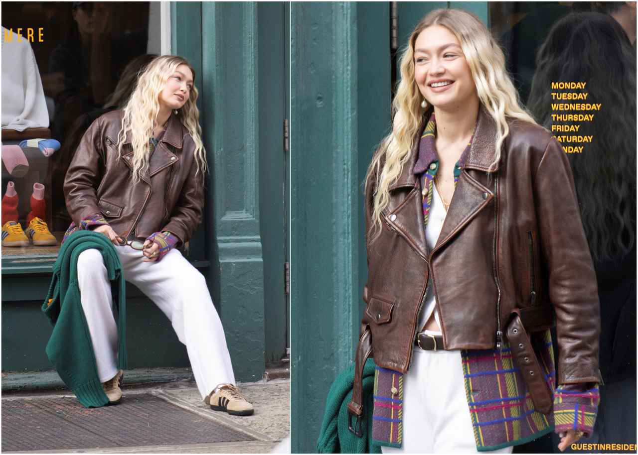 Guest In Residenceの旗艦店前で撮影するジジ・ハディッド。