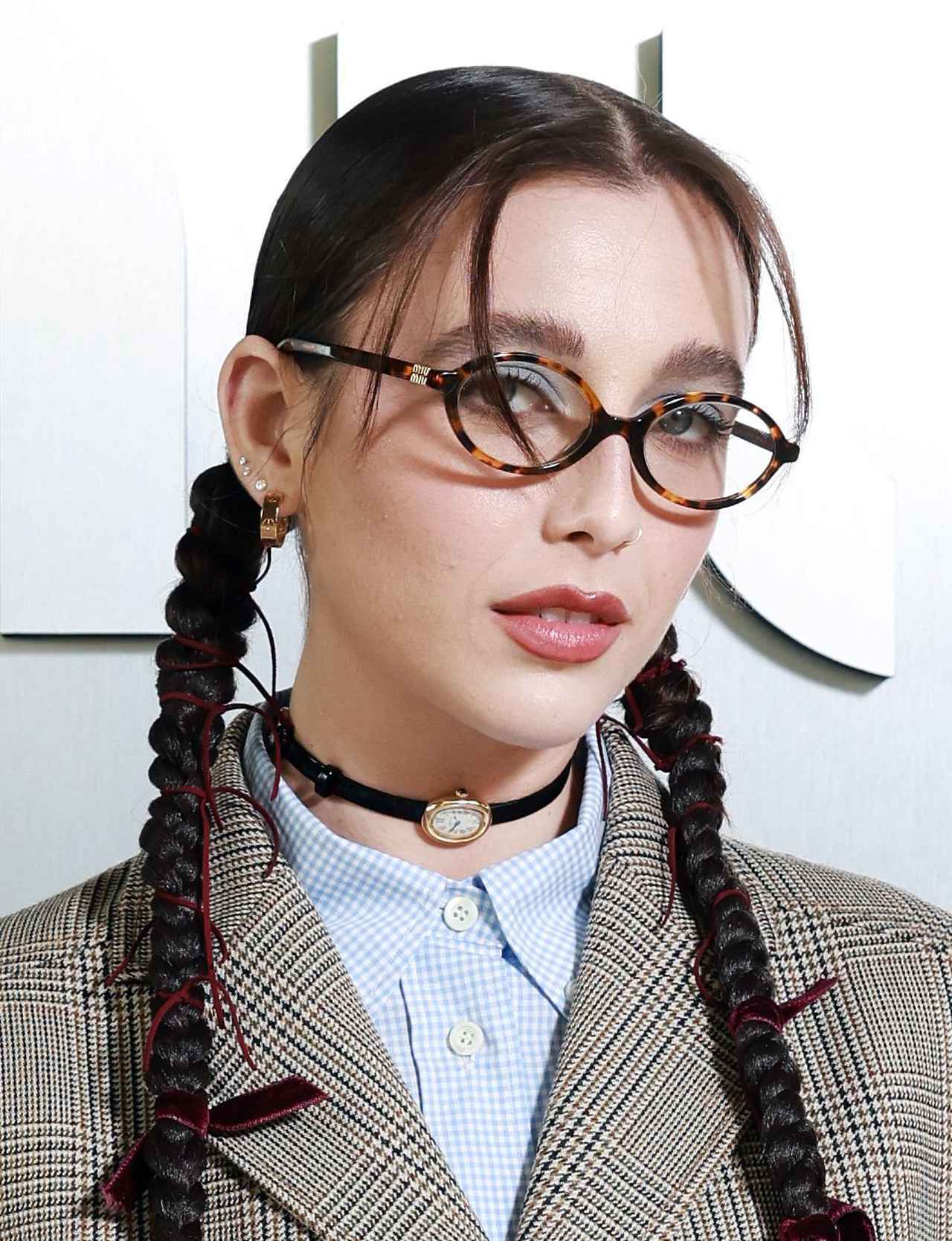 前髪を残したおさげヘアにメガネ、足元はソックスにローファーと、少しナードなスクールガール風のルックスがかわいい。