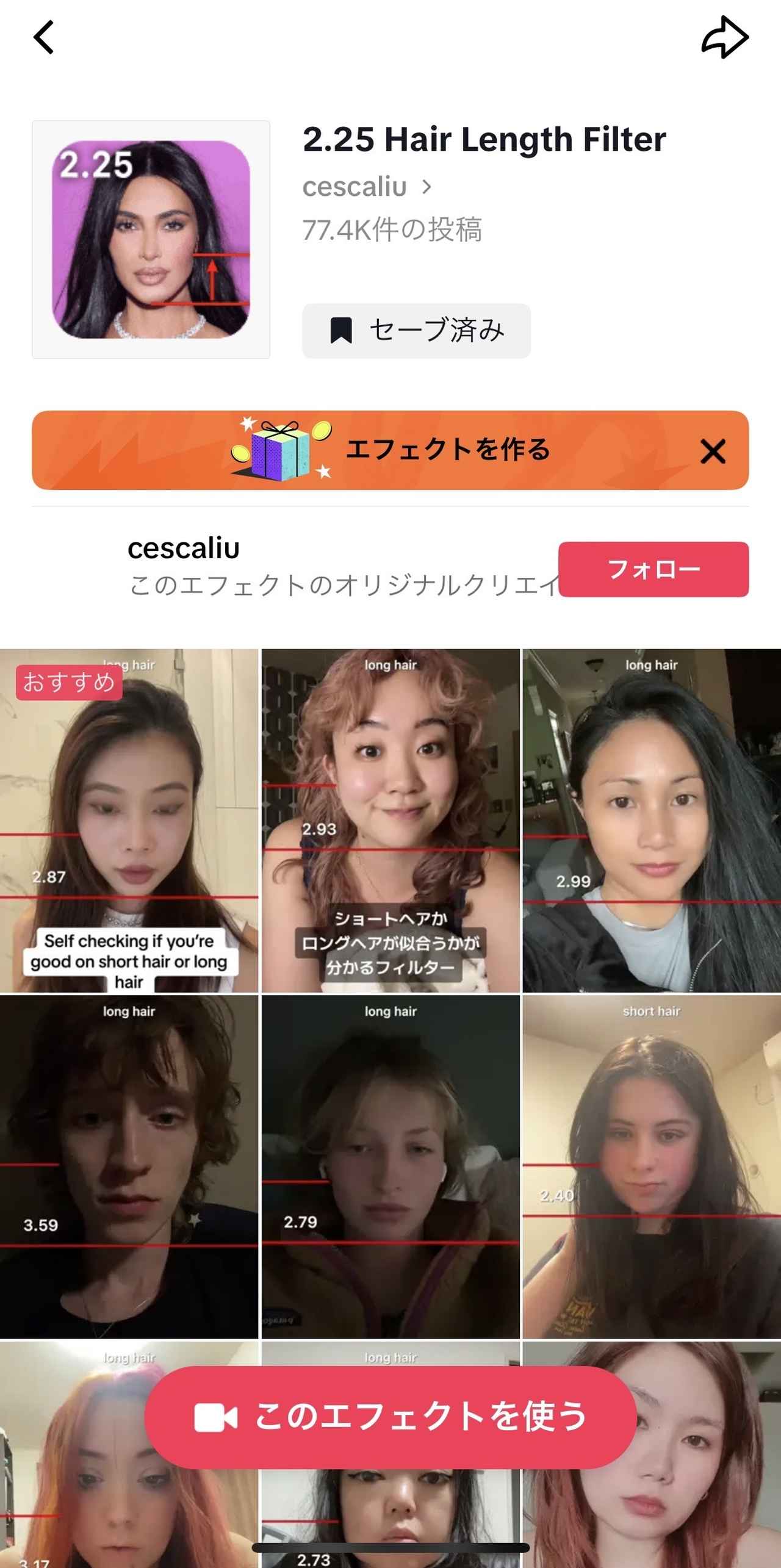 そんな“自分に似合う髪の長さは?”という疑問を解決できるとして海外で話題を呼んでいるのが、「2.25 Hair Lengs Filter」というTikTokのフィルター。