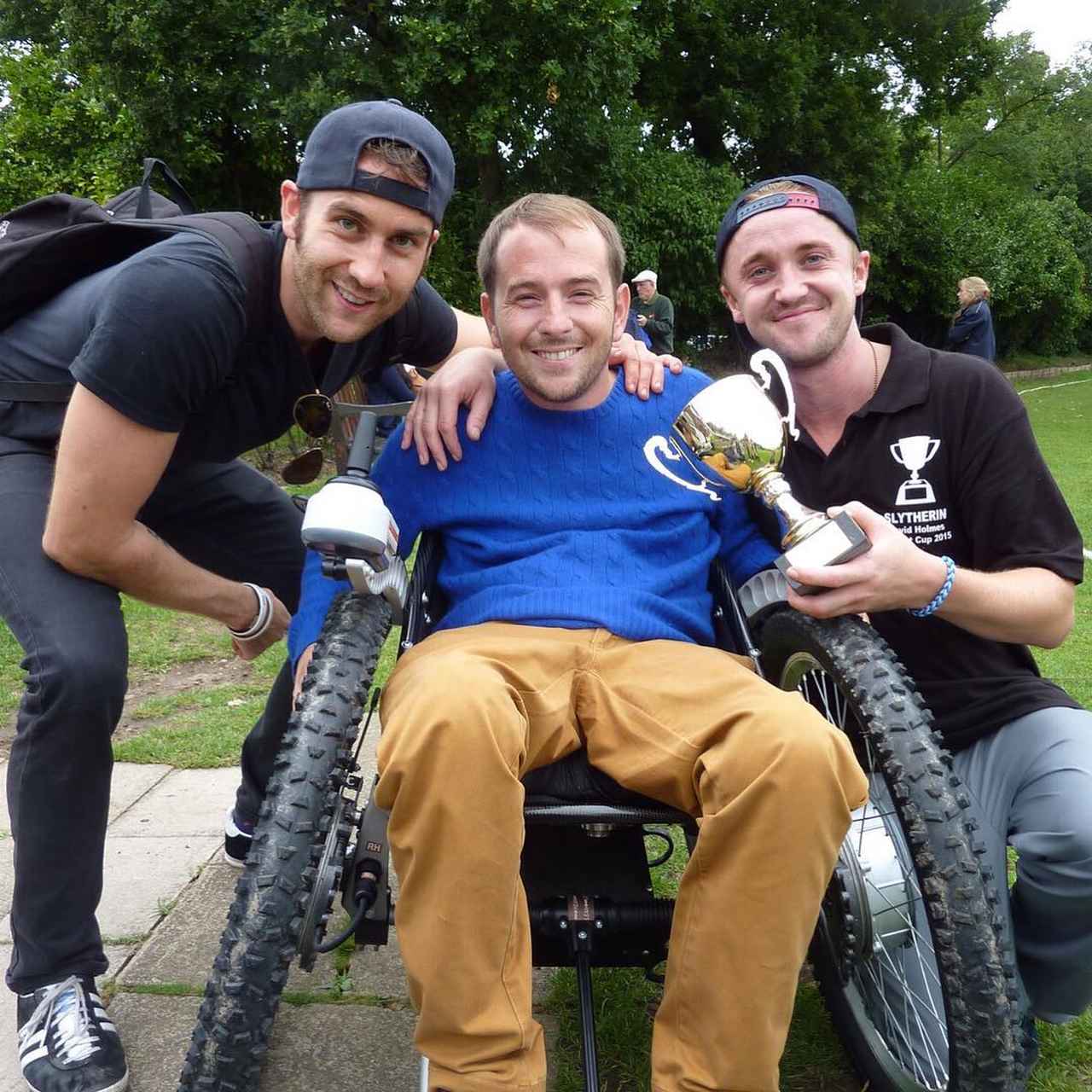 2015年にデヴィッドが事故直後に入院していた病院のためのチャリティ・クリケット試合に参加したトム・フェルトン(右)とマシュー・ルイス(左)。©David Holmes/Instagram