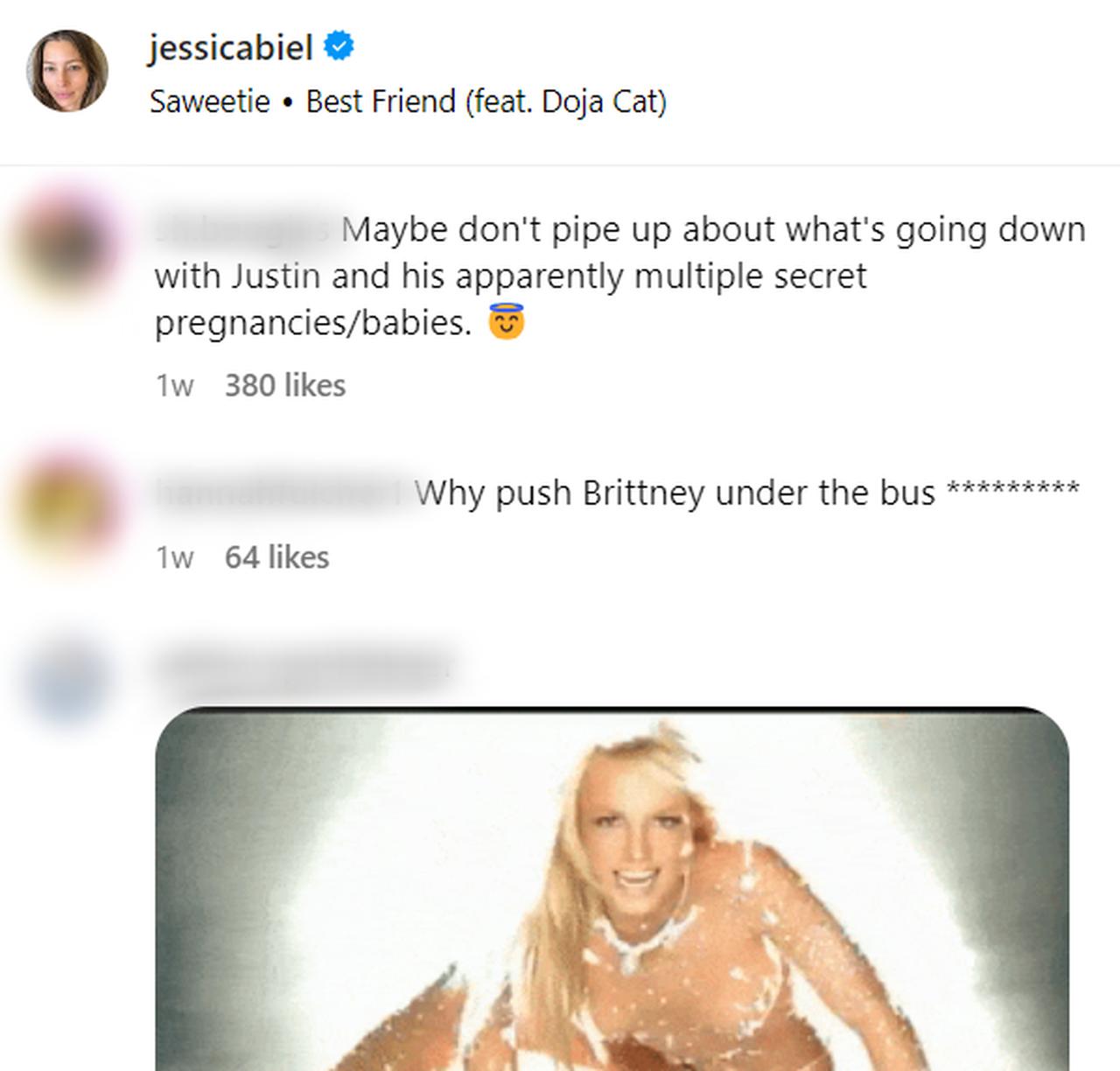 ジェシカ・ビールのインスタグラムのコメント欄にはジャスティンに対する批判的なコメントが。