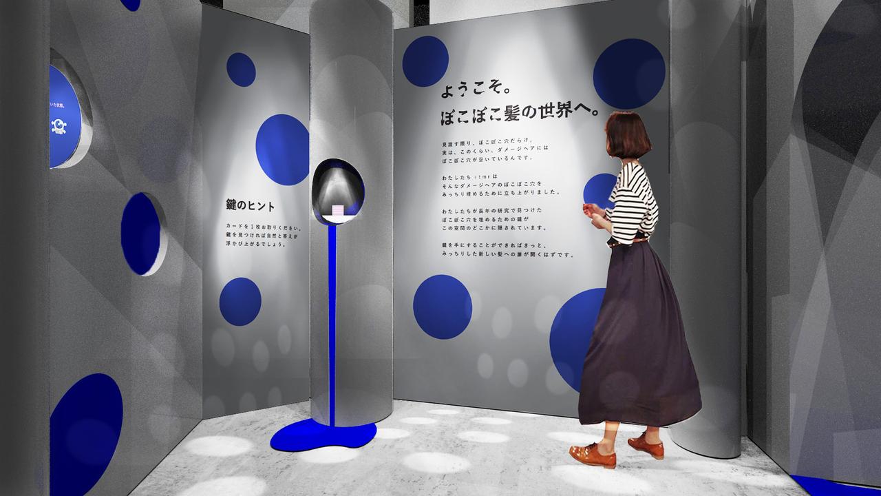 「あなぼこをみっちりうめたい展」の会場に入ると、待ち受けるのはダメージを受けた毛髪の内部で穴が空いている状態をイメージした“ぼこぼこ髪ゾーン”。見渡すかぎり「あなぼこ」だらけの世界の中、「あなぼこ」を埋めるカギを見つけ出すと、“みっちり髪ゾーン”への扉が開く。