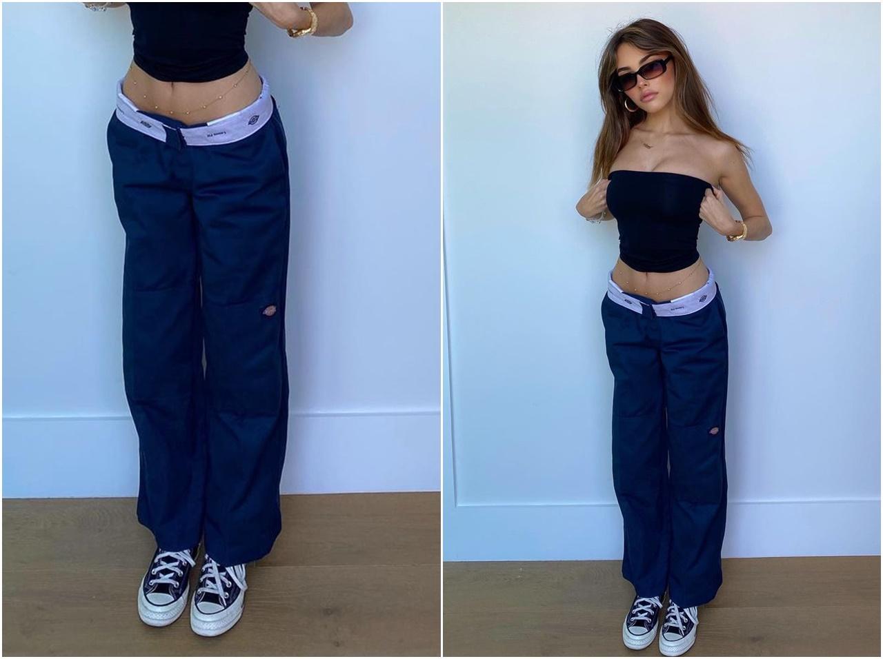 マディソンは、ダブルニータイプのワークパンツのネイビーをチョイス。ウエスト部分を折り返して裏面を見せ、トップスにはチューブトップを取り入れてY2Kコーデに。