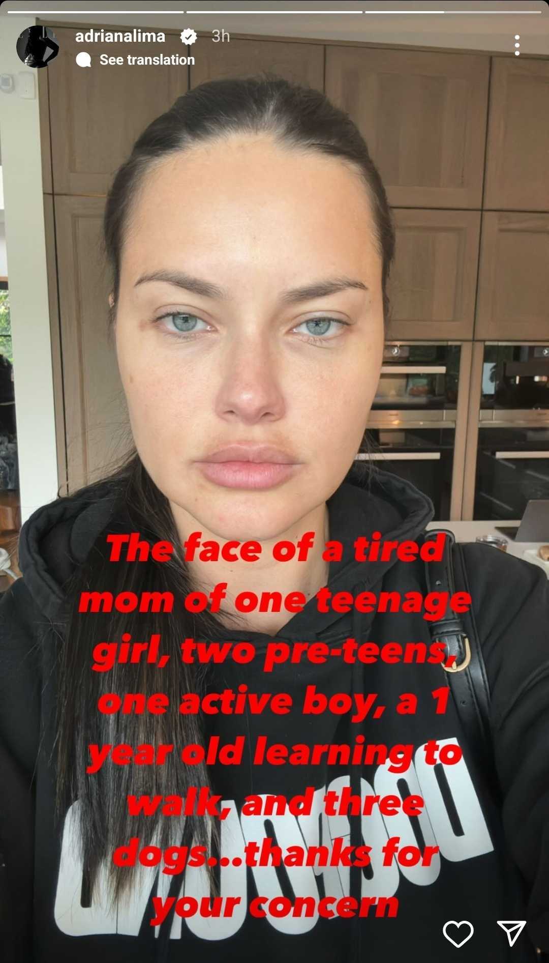 アドリアナはスッピンの写真をアップし、「10代の女の子がひとり、10代前の子どもが2人、うちひとりは活発な男の子で、ひとりは歩き始めたばかりの1歳児、そして3匹の犬がいる母親の疲れた顔がこれです。お気遣いありがとうございます」と綴った。