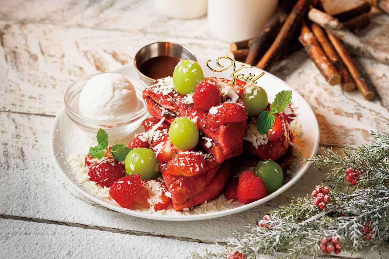 「ベリークリスマス2023」は、ベリー×チョコ×ぶどうを使ったクリスマスカラーのフレンチトースト。真っ赤なラズベリーアパレイユに浸して焼き上げ、チョコカスタードをサンド。濃厚なチョコとさっぱりとしたベリーやぶどうの組み合わせが楽しめる。