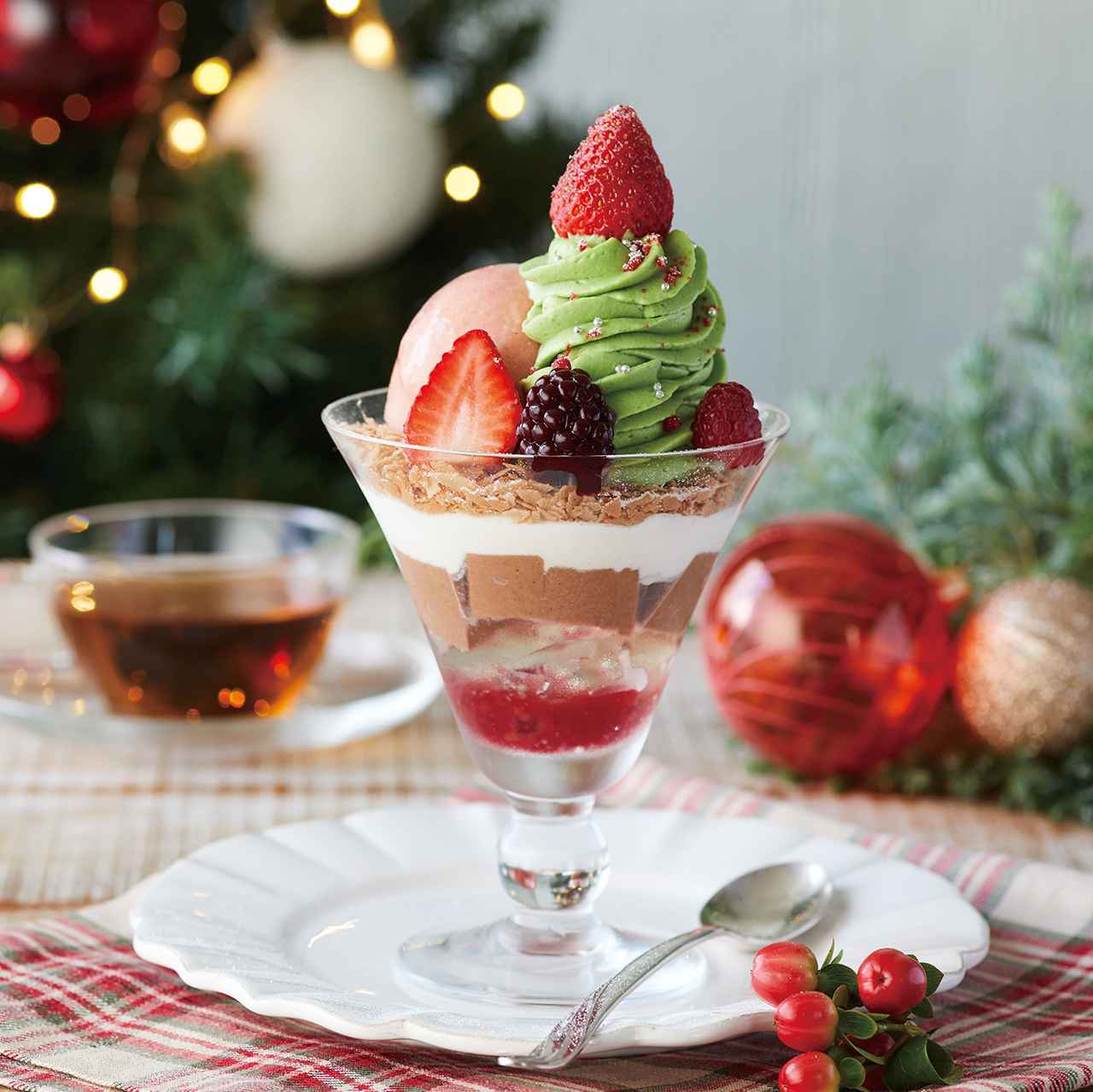 「苺とピスタチオホイップのクリスマスツリーパフェ」は、アールグレイショコラプリン、白ぶどうのジュレ、ストロベリージェラートなどをグラスに重ね、ピスタチオホイップを絞り、クリスマスツリーをイメージしたデコレーションで仕上げたパフェ。