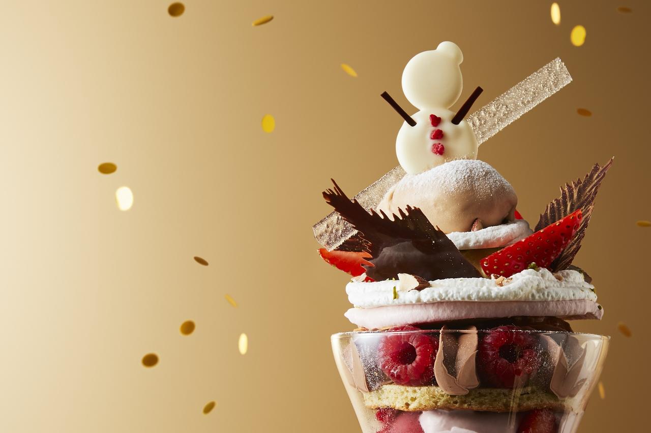 純白の雪がふわりと舞い降りる中で、愛らしいスノーマンが出迎えているような冬のパフェは、グラスの中に苺、ラズベリー、カシスの味わいを閉じ込めた3種のベリーを楽しむチョコレートパフェ。