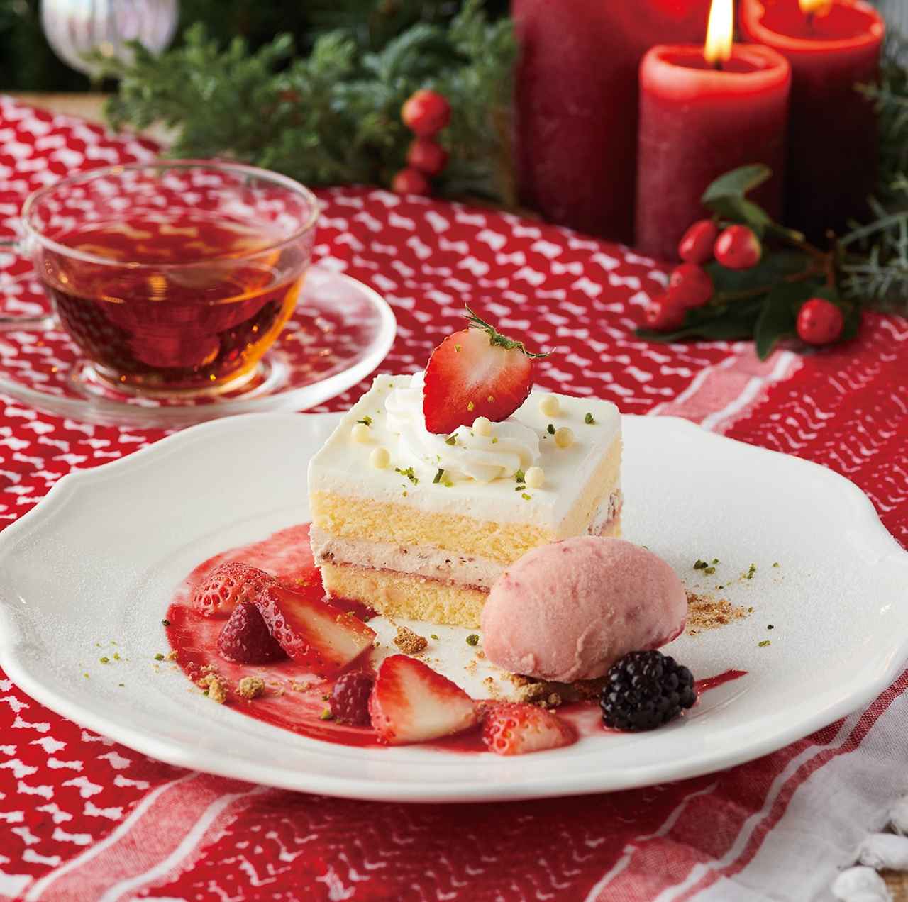 さらにひとつの新作として「苺とアーモンドクランチのクリスマスケーキプレート」も登場。ミルクホイップとアーモンド風味のホイップの2種類をスポンジと重ねたショートケーキに、フレッシュ苺などのベリーとストロベリージェラートを合わせたプレートで、クリスマスシーズンにぴったり。