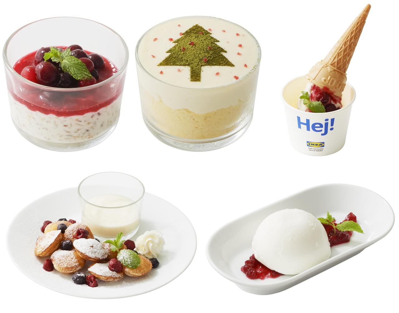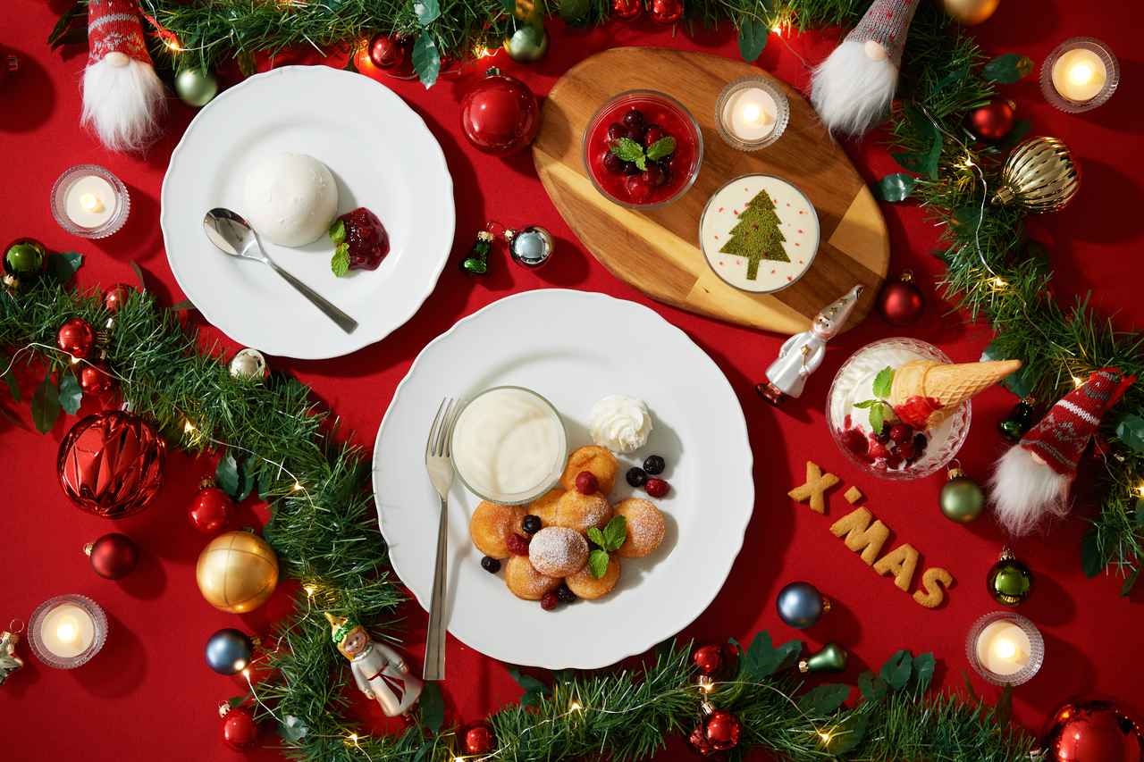 クリームチーズ風のディップが楽しい一口サイズの甘いミニパンケーキや、シナモン香る北欧のクリスマスによく食べられるライスプディング、ツリーのデザインを描いて中にロールケーキが丸ごと一個入ったボリューム満点のミニツリーパフェなど、味だけでなく見た目もかわいらしくにぎやかなクリスマス気分を盛り上げるスイーツが登場する。