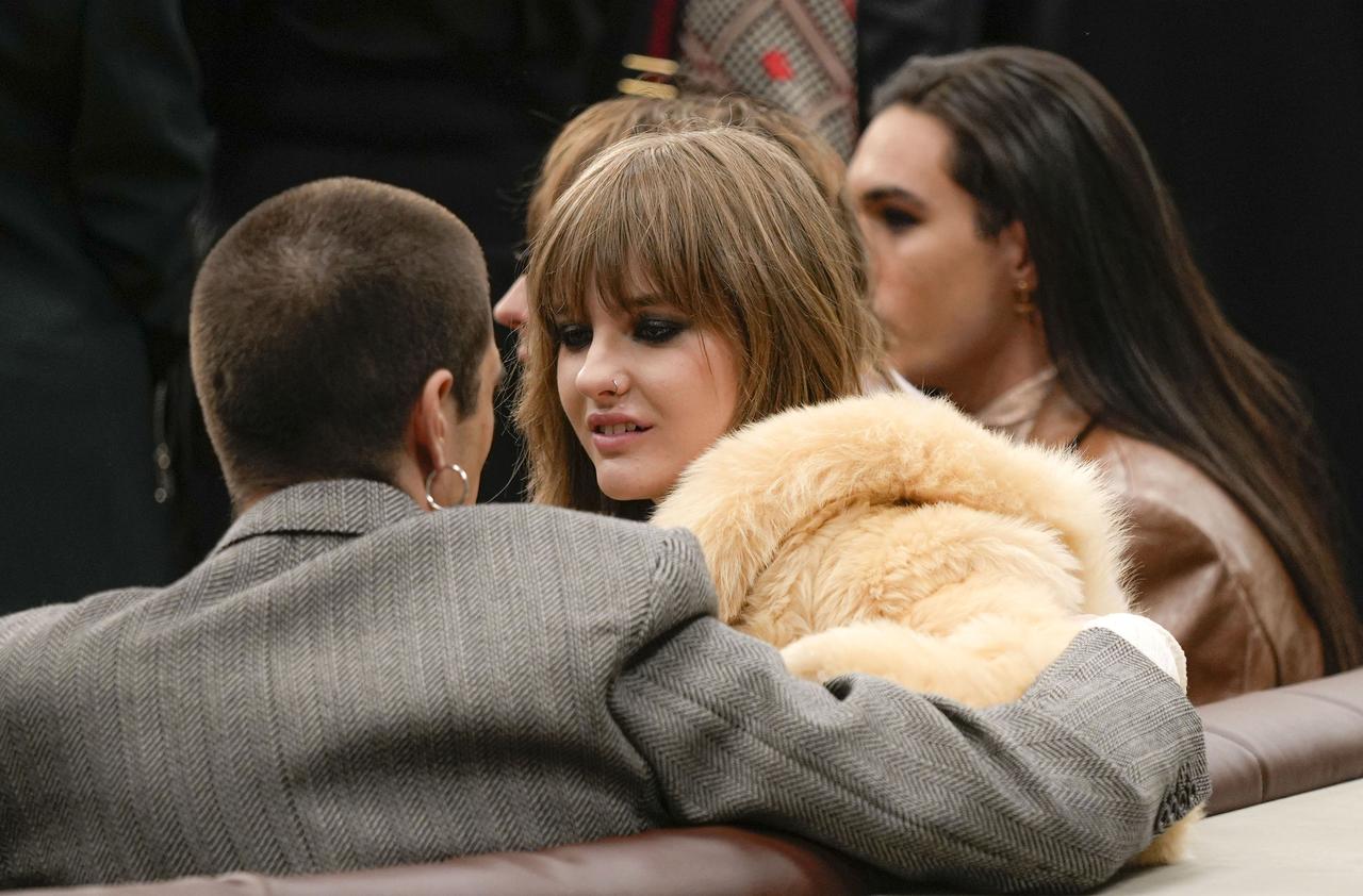 GUCCIのファッションショーのフロントロウで話し込むダミアーノとヴィクトリア。
