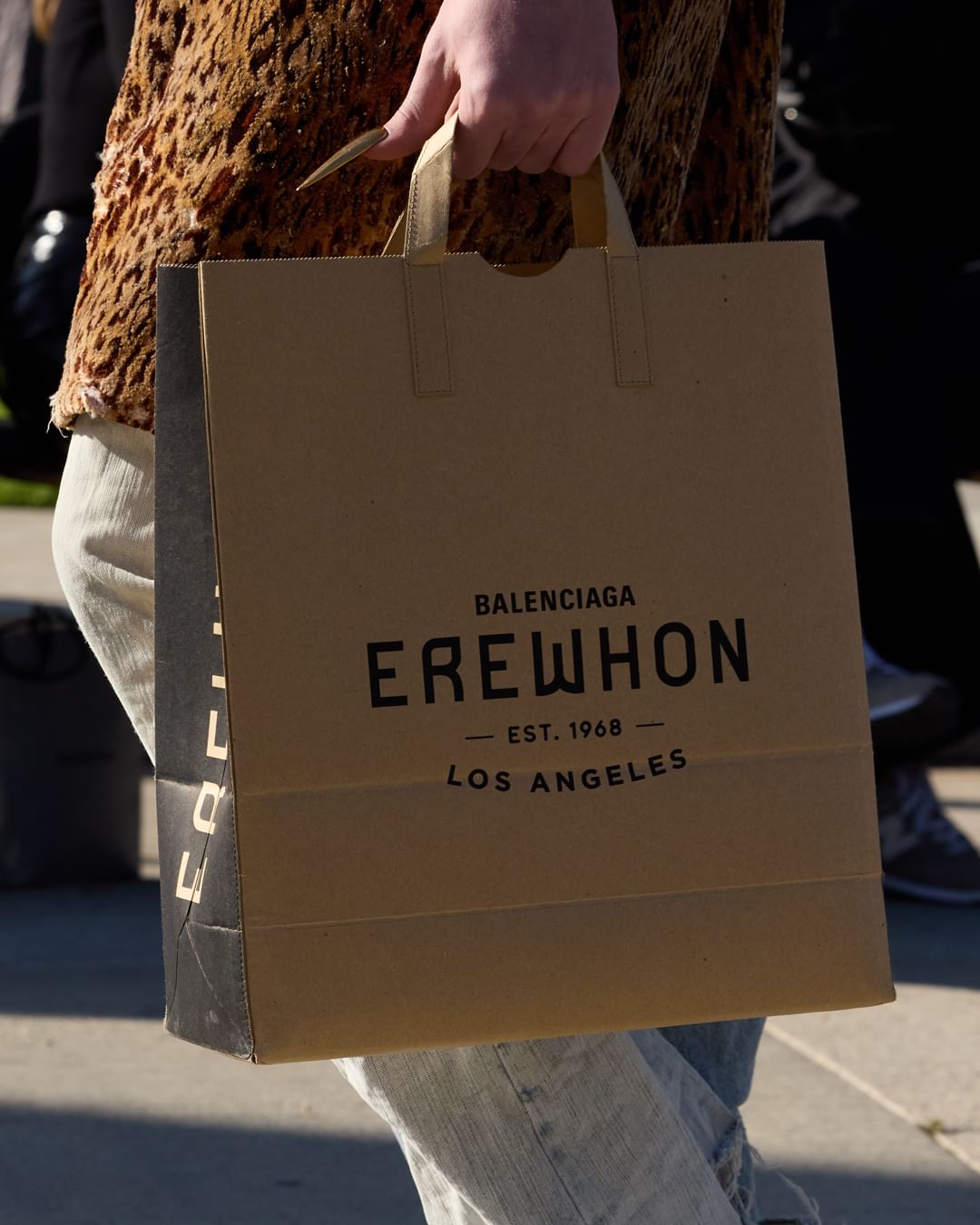 そんなバレンシアガのショーで最も注目を集めたのが、高級スーパーであるErewhonとのコラボアイテム。バレンシアガは、これまでにも一風変わったアイテムを発表して話題になることが多かったが、Erewhonとのコラボでは、Erewhonの紙袋風のアイテムが登場。