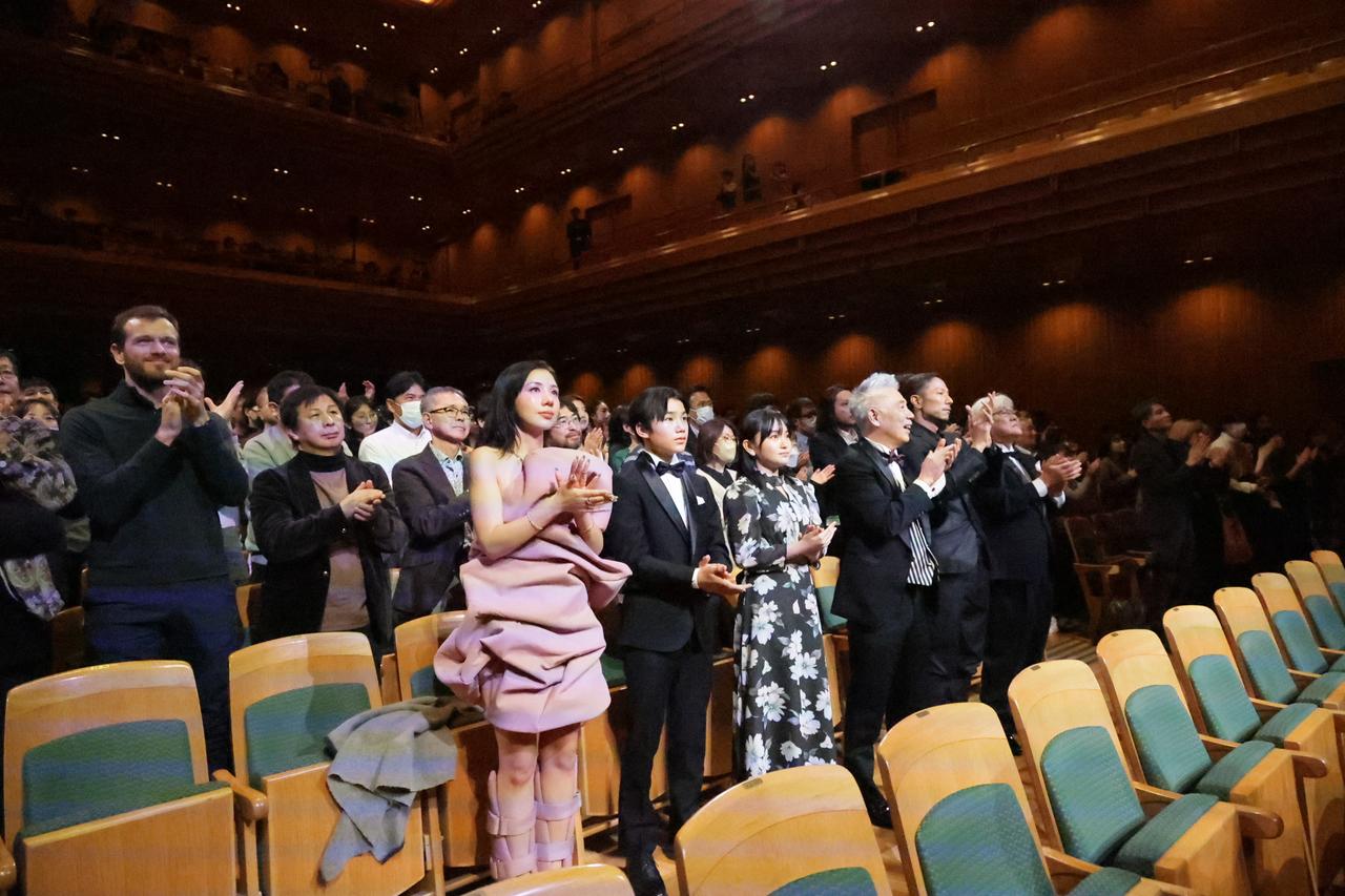 当日は 仲里依紗(前列左、エミリ役)や寺田心(前列左から2人目、ラジャー役)、鈴木梨央(前列左から3人目、アマンダ役)らキャストや製作陣も一緒にシネマ・オーケストラを鑑賞。