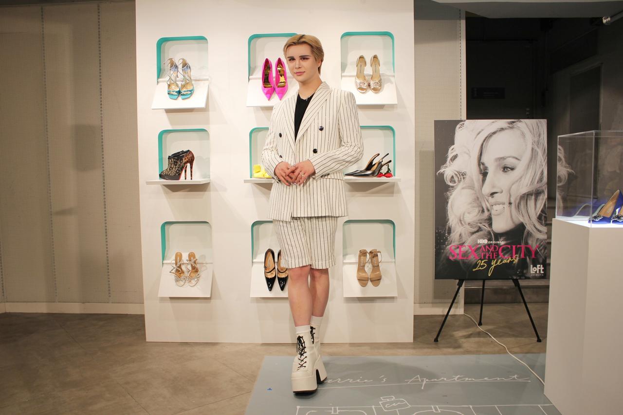 キャリーが愛してやまないMANOLO BLAHNIK (マノロ ブラニク)などのハイヒールがディスプレイされた「“Wall of Heels”(ウォール・オブ・ヒールズ)」を前にすると、キャリーのハイヒールへの強い愛に共感し、「僕も靴を大事にしていて、このヒールもプライベートで履いちゃうくらい。僕もヒールが高いものが好きで、これを履いたら2メートルくらいになってる(笑)」と、この日履いていた17センチのプラットフォームヒールを指さした。