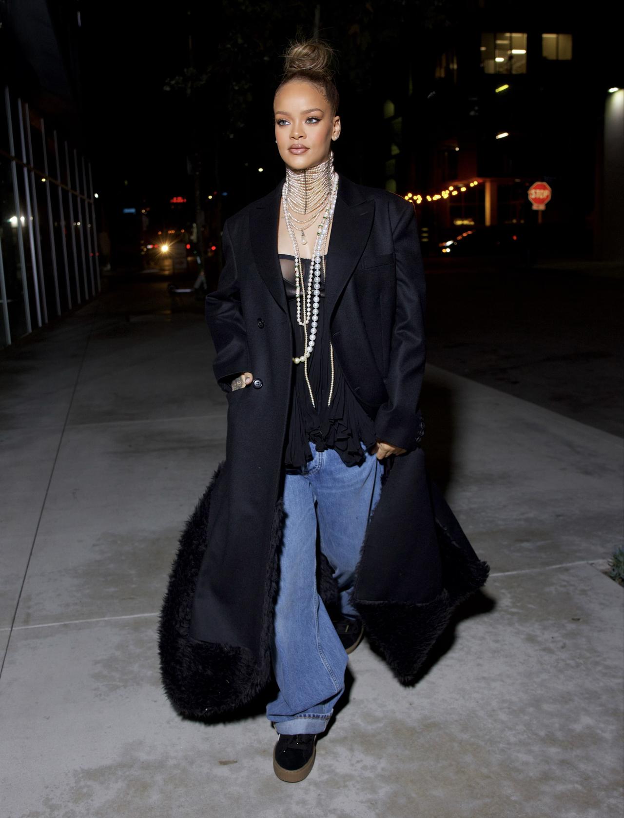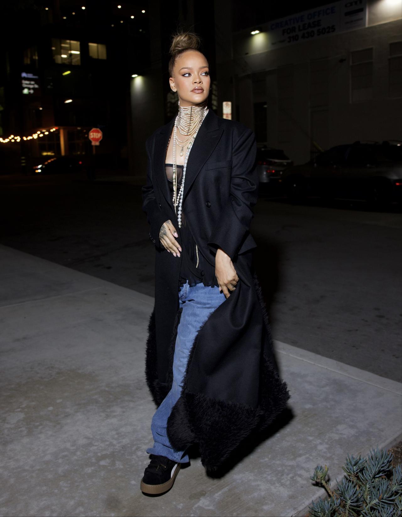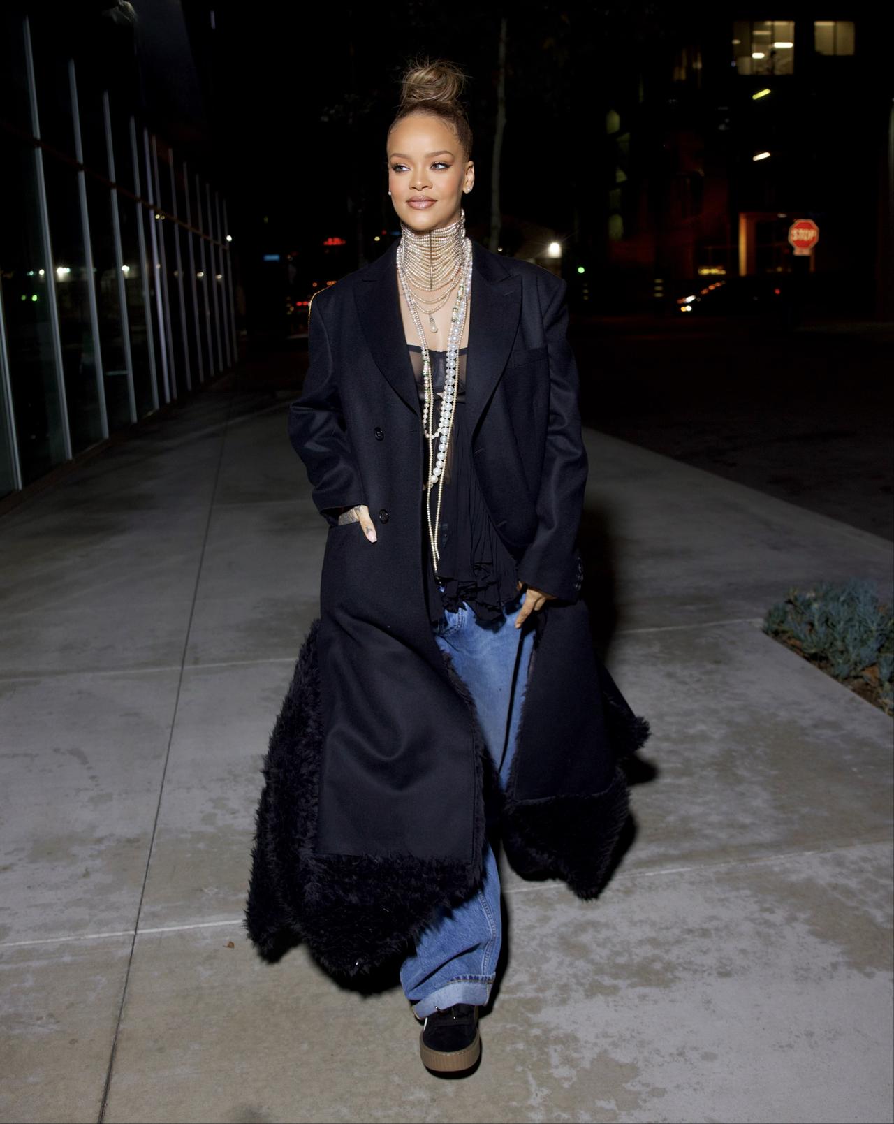 この時リアーナはケイト(Khaite)のビスチェ風キャミソールに、ジョン・ガリアーノがデザインしたヴィンテージのディオール(Dior)のネックレスを着用し、ドレッシーなスタイリングをカジュアルダウンさせるかのようにデニムを合わせたリアーナらしいスタイリングをしていたのだが、じつはこの時着用していたコートが、ジュンヤワタナベのものだった。