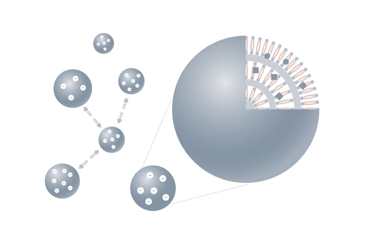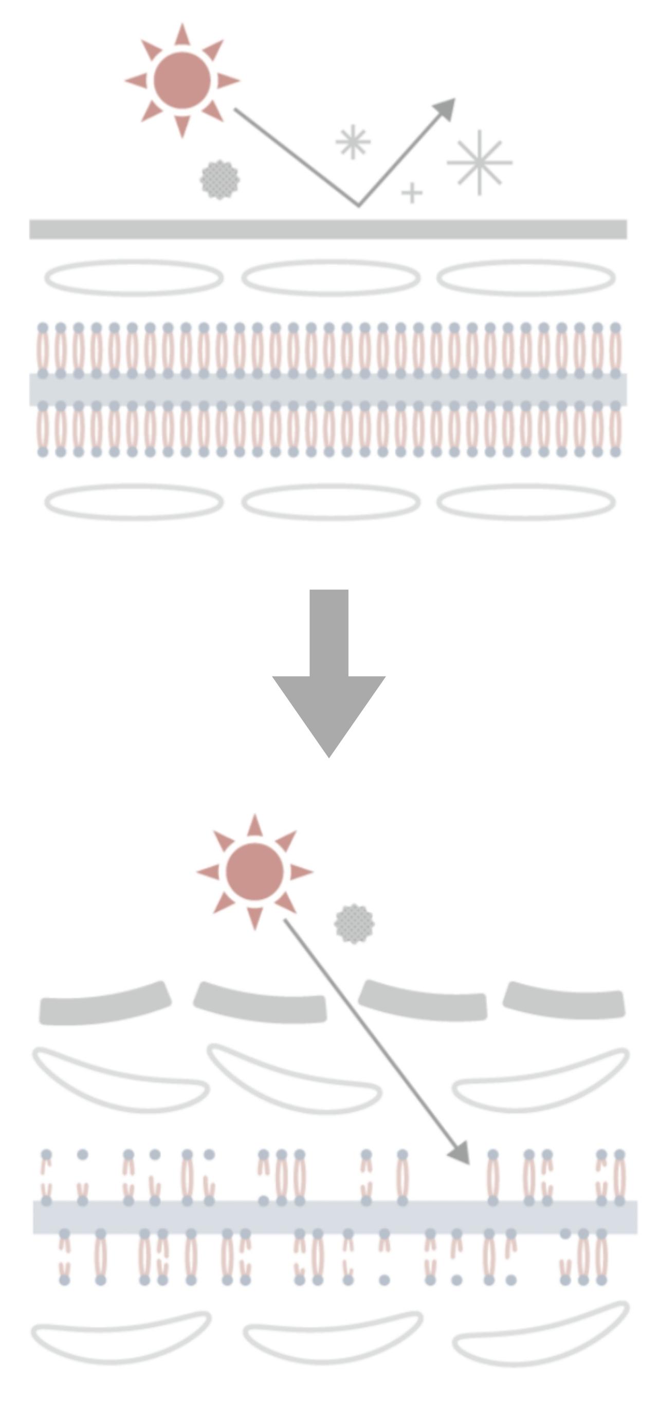 油分と水分が何層にも重なりあった毛穴よりも小さなカプセルで、肌に触れると油分と水分が一層ずつ剥がれていく仕組み。カプセルに内包された水溶性と油溶性の栄養豊富な成分が肌へ素早くなじんで、すみずみまで浸透していく。