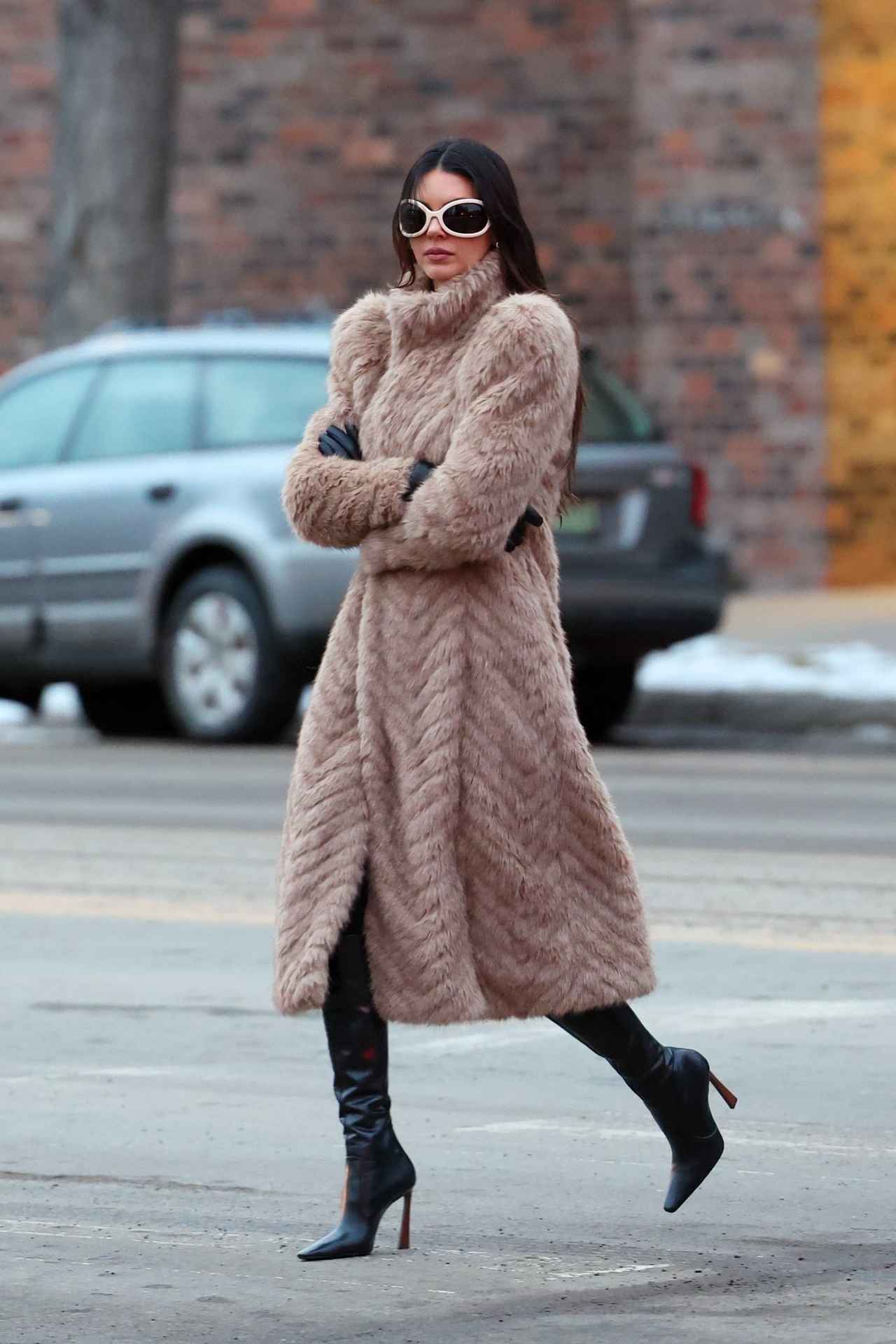 ボリューム感のあるコートには、ケンダルのようにシャープなデザインのニーハイブーツを合わせてすっきりとまとめるのが旬なスタイリング。