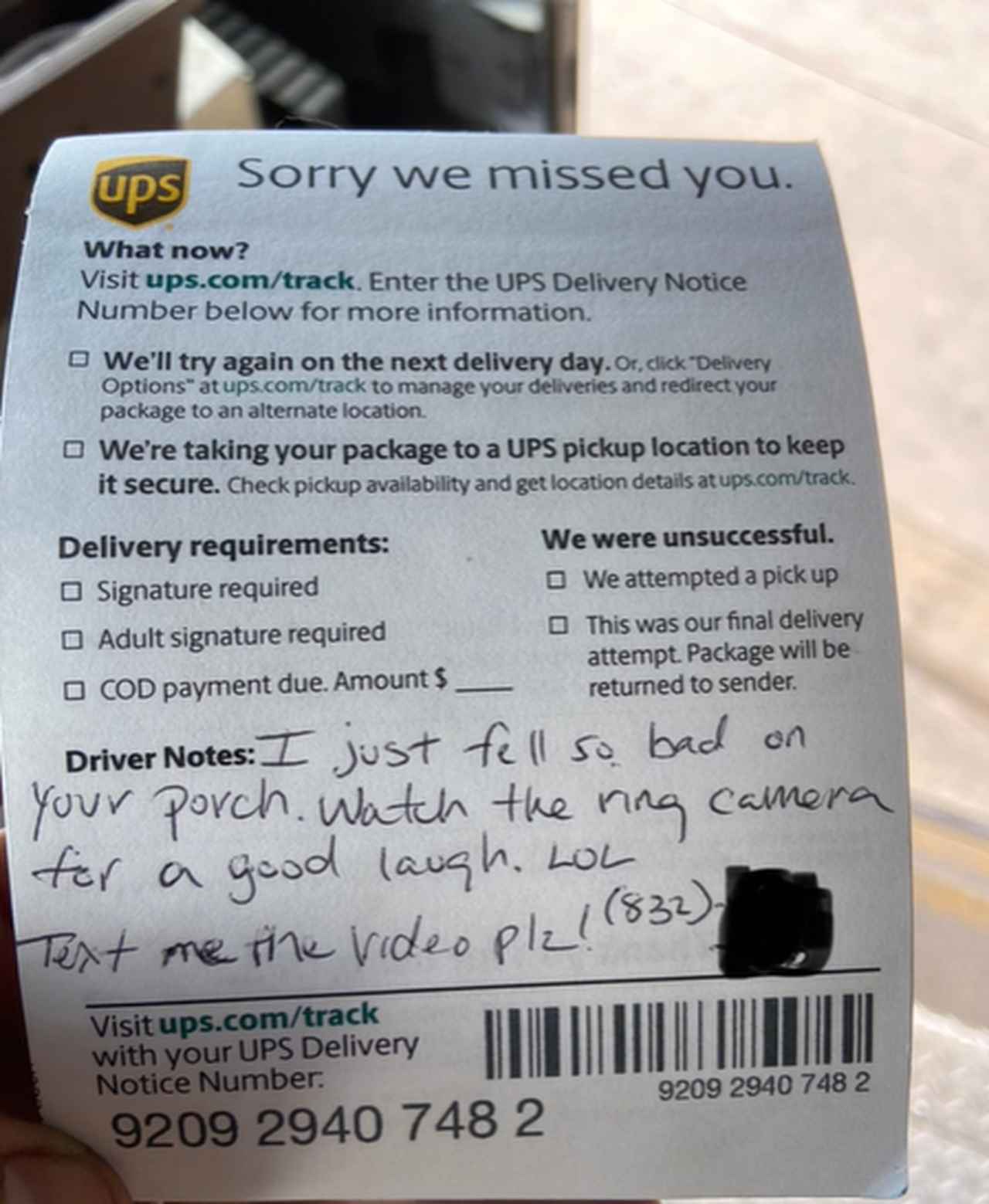 「あなたの玄関で豪快な転び方をしました。笑えると思うから、防犯カメラを見てみてください(爆笑)。自分にもその動画を送ってください!(※配達員の電話番号)」